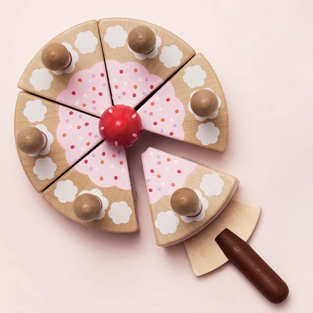 Każdy kawałek tortu można oddzielać i ponownie łączyć dzięki sprytnym rzepom, co daje dziecku możliwość wielokrotnej zabawy w serwowanie i „krojenie” tortu. Zdejmowane świeczki i ozdobna truskawka na środku sprawiają, że zabawa staje się jeszcze bardziej realistyczna. Zabawka została pomalowana bezpiecznymi farbami na bazie wody i wykonana z drewna certyfikowanego FSC®, co gwarantuje jakość, trwałość i bezpieczeństwo.