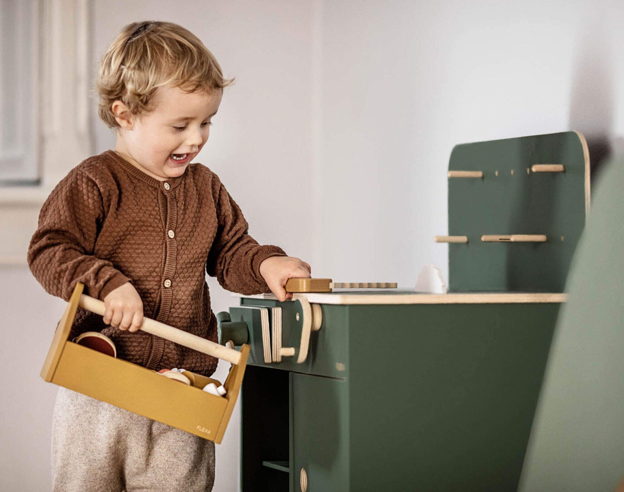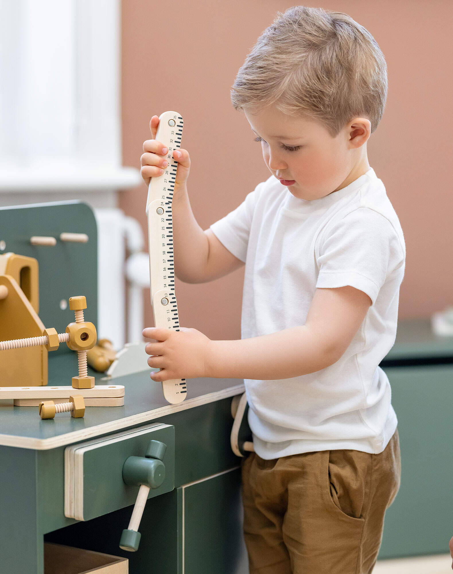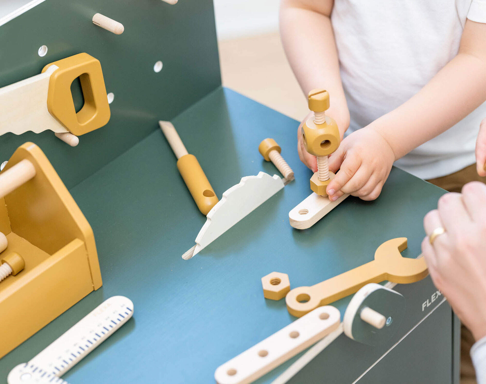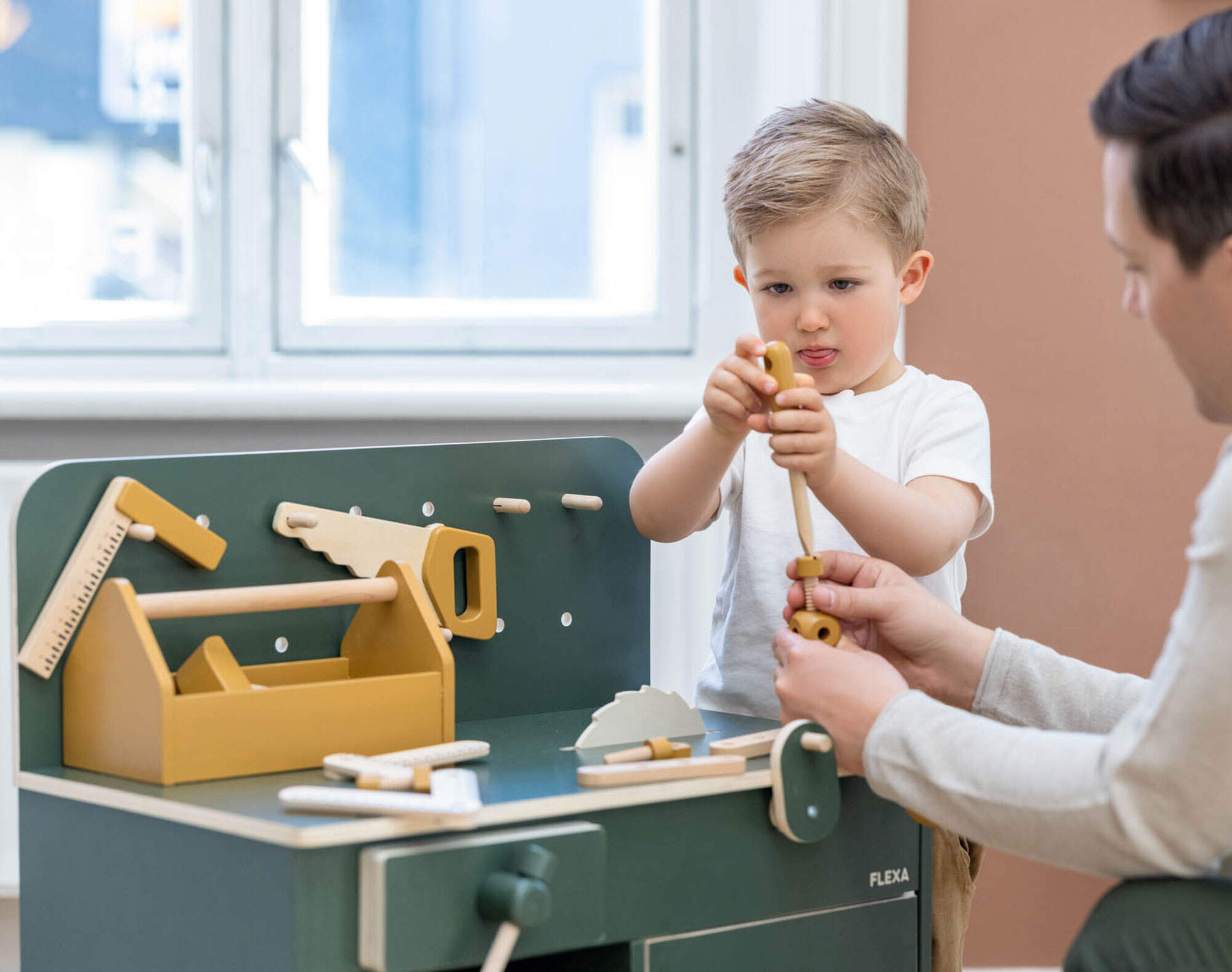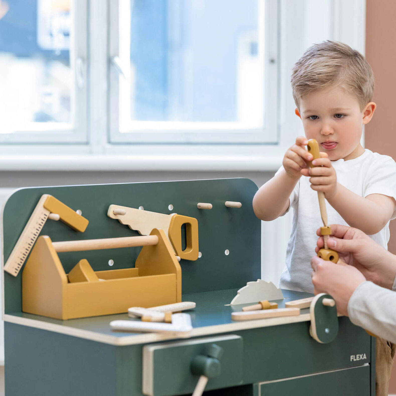 Drewniany warsztat majsterkowicza to Idealny zestaw dla młodego rzemieślnika, który jest ciekawy demontażu i naprawy rzeczy, uwielbia naśladować dorosłych i zabawa w majsterkowanie sprawia mu niezwykłą frajdę! Ten wolnostojący warsztat duńskiej marki Flexa jest wykonany z drewna brzozowego, połączonego ze sklejką i płytą MDF. Ze szczegółami zadbano, o każdy drobiazg.