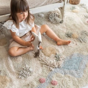 Prostokątny dywanik do zabawy z wieloma teksturami i ciekawymi detalami, imitujący miniaturowy krajobraz z rzeką i ścieżką spacerową. Wykonany z naturalnej bawełny, z różnymi wysokościami runa i różnymi technikami tkania, ten dywan jest wykonany w mieszance miękkich kolorów naturalnych, oliwkowych i perłowo-niebieskich, z detalami w kolorze popielatego różu i brązu. W zestawie praktyczna bawełniana torba z uchwytami i sznurkiem oraz mini-poduszka w kształcie konia.