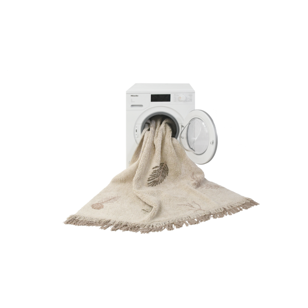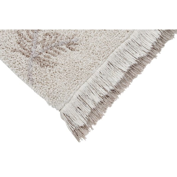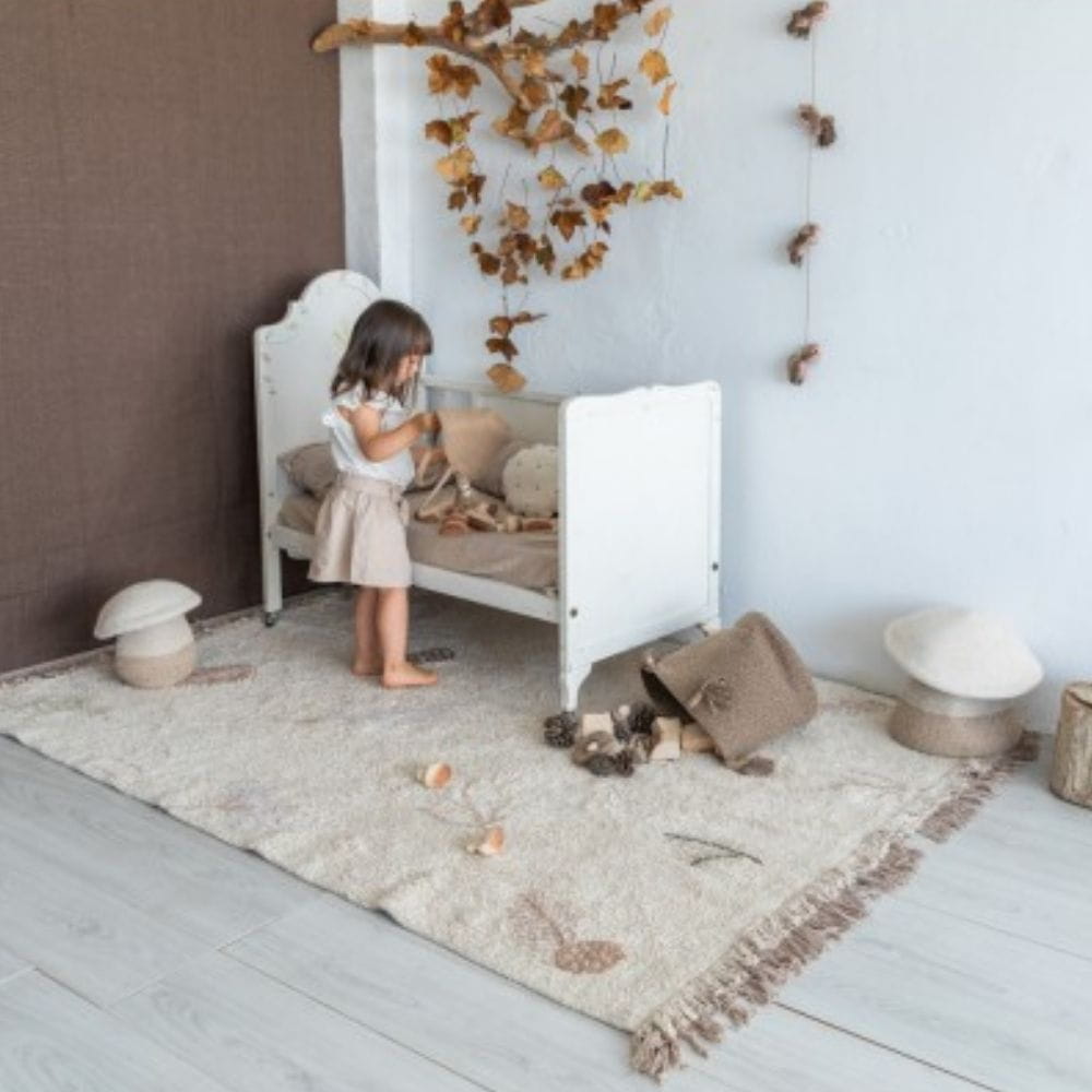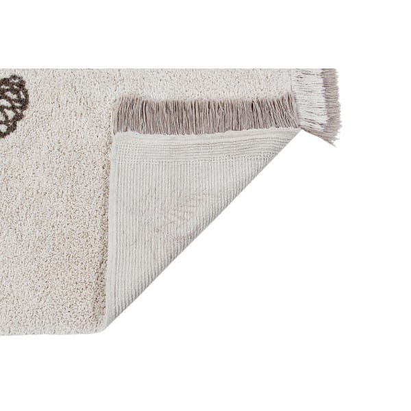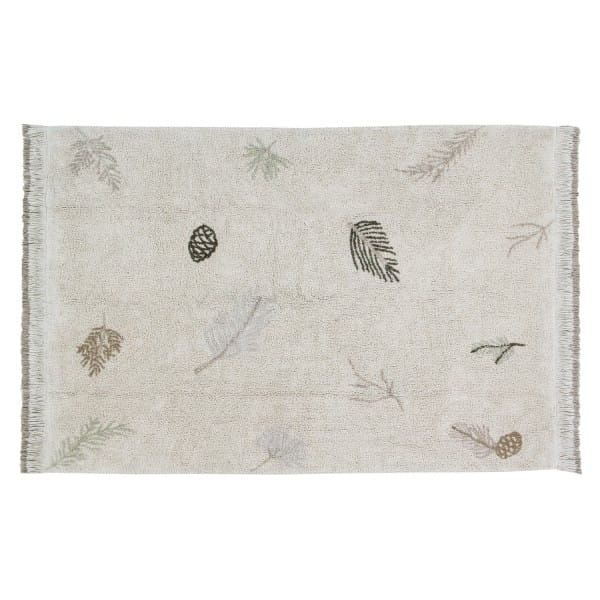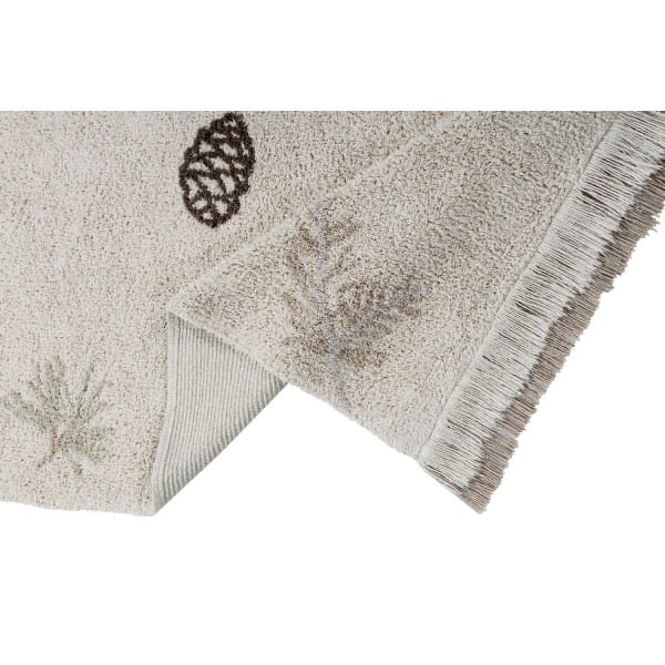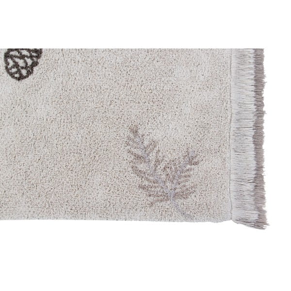 Pine Forest Jak zbiór małych skarbów na leśnym spacerze: w tym dywanie pojawiają się drobne gałązki, liście, zioła lub szyszki, zakończone dwoma rzędami frędzli zachodzących na brzegi, w delikatnych kontrastowych odcieniach brązu i lnu. Dywan Pine Forest wzorowany na dywanie Botanic Plants (poprzedni projekt), w którym kolorowy tropikalny nadruk ustępuje teraz bardziej stonowanej palecie inspirowanej śródziemnomorską roślinnością. Dzięki temu dywanowi natura może wymknąć się z pokoju dziecięcego i wejść również do salonu.