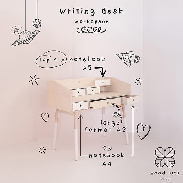 Biurko dziecięce Wood Luck Design wykonane jest z najwyższej klasy sklejki brzozowej (certyfikat CARB) oraz z płyty MDF zgodnej z normą EN71/3 – normą dotyczącą mebli dziecięcych i zabawek.