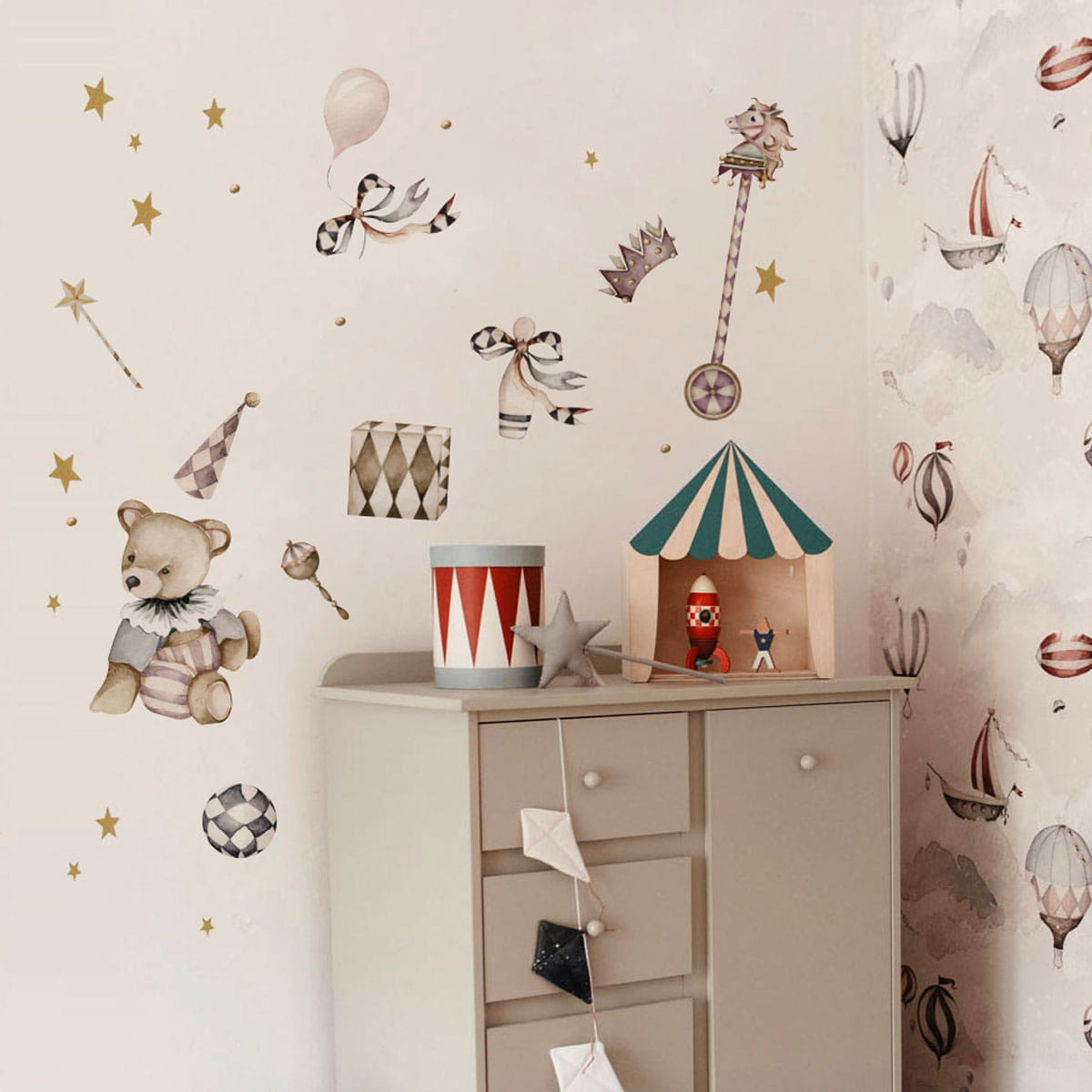Motywem przewodnim jest jednak pluszowy miś. Miś, który jest zawsze grzeczny (nie tylko dziś). Który przyjaźni się z Maluszkami od dawna, od kiedy przywędrował do nas ponad 100 lat temu z Ameryki. Już tyle pokoleń tuli go do snu! Dlatego uhonorowaliśmy naszego Teodora (Teddy’ego). Oto zestaw w delikatnych barwach: Teodor i wszystkie jego ulubione zabawki! Elementów jest aż 18 (licząc też samego Teodora). Nie są gigantyczne, ale na tyle duże, że można nimi zagospodarować przestrzeń nad łóżkiem.