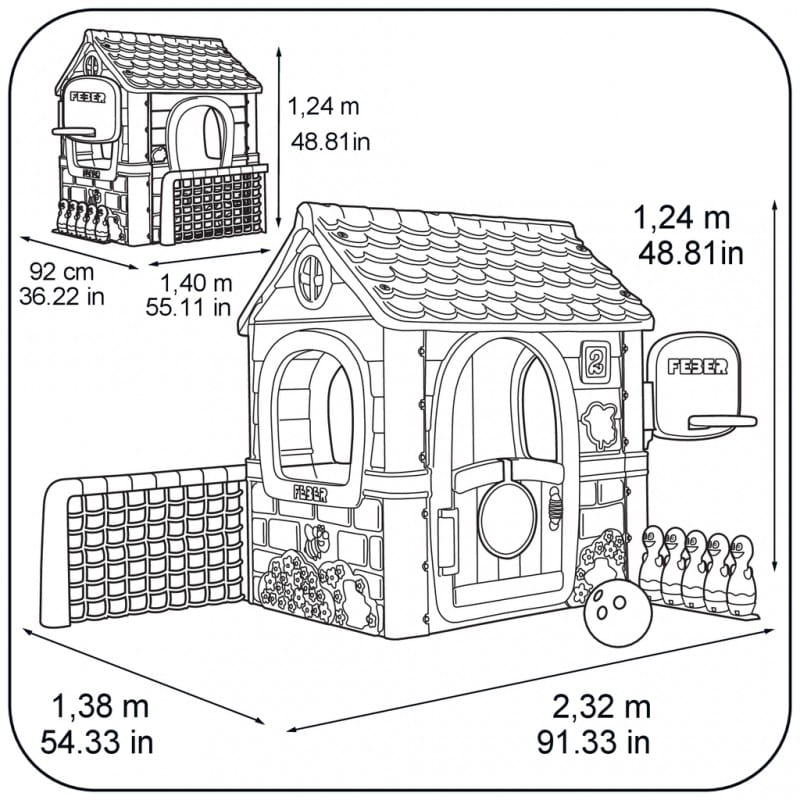 FEBER Dom Aktywności Wielofunkcyjny Domek 6 w 1 z Dołączonymi Grami to pierwszy domek do zabawy, który ma dołączone 6 gier, dzięki którym Twoja pociecha nie będzie wiedzieć co to nuda! Zestaw zawiera gry takie jak: kręgle, gry rakietowe, piłka nożna, koszykówka (z regulowanym koszem), tarcza do piłek na rzep. Po zakończonej zabawie można wszystko złożyć i nie ma bałaganu! Domek solidnie zbudowany, bardzo łatwy w montażu.