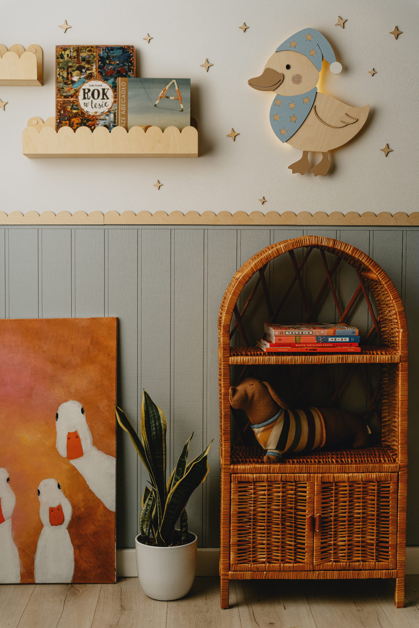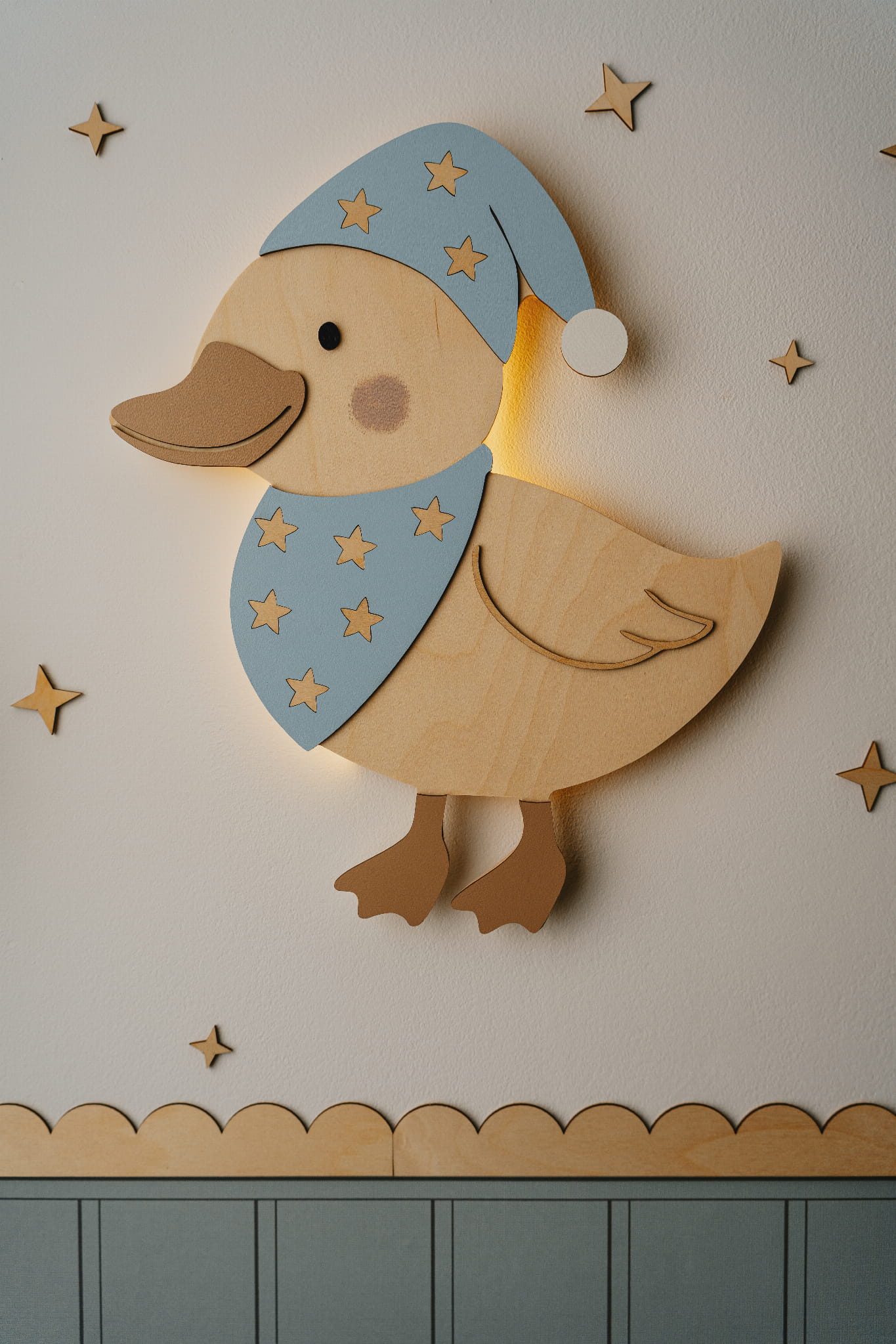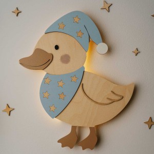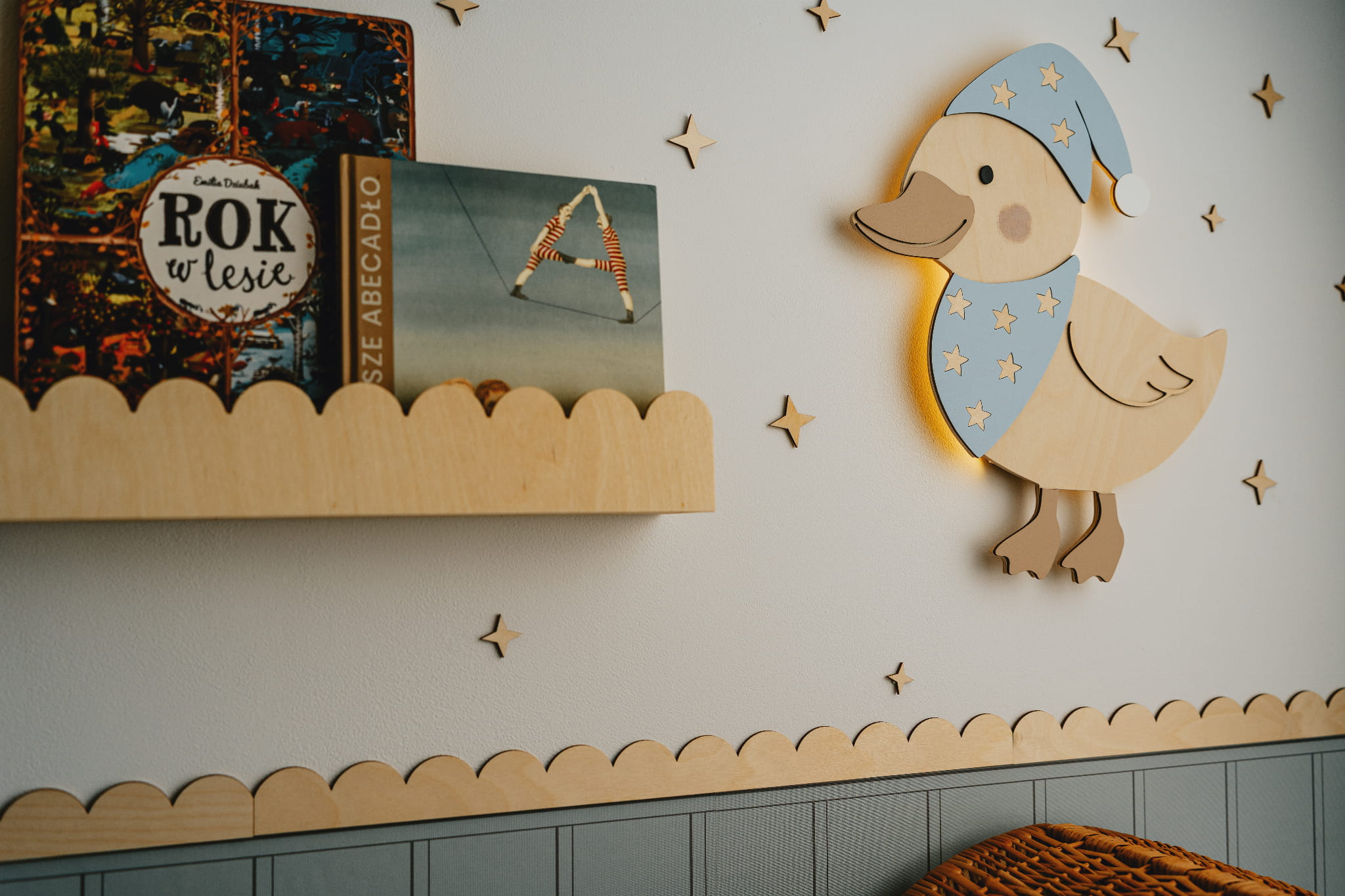 Drewniana lampka nocna kaczuszka do pokoju dziecka. Ręcznie wykonana z naturalnej sklejki, daje ciepłe, miękkie światło sprzyjające wyciszeniu i spokojnemu zasypianiu. Dostępna w 3 wariantach.