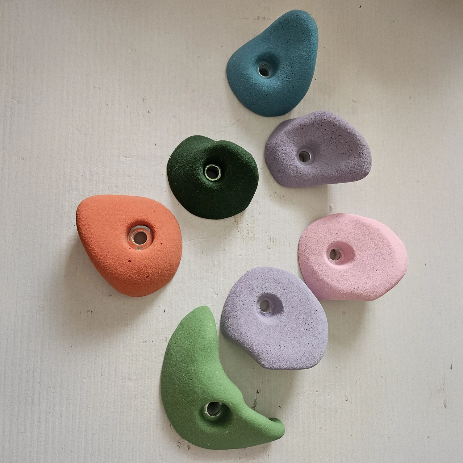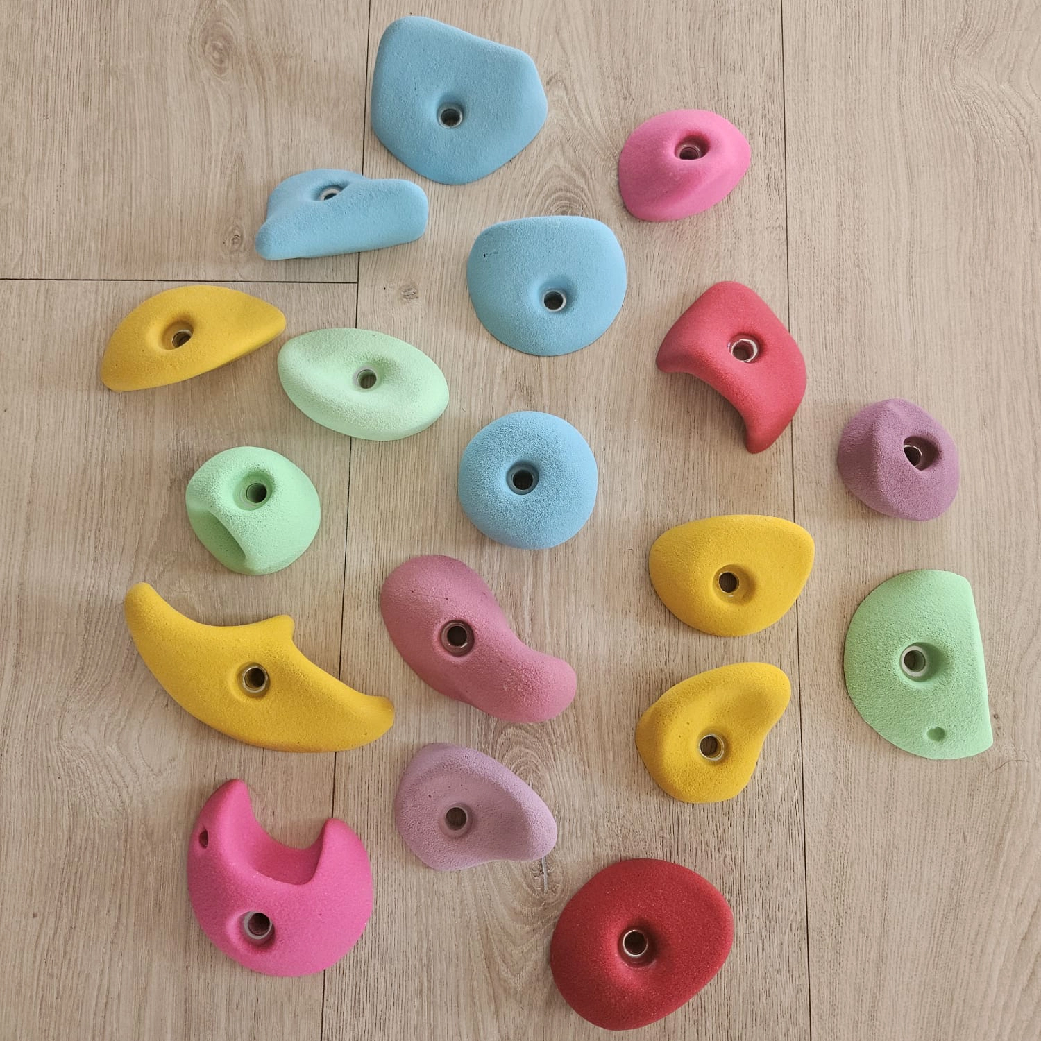 - Zestaw 15 sztuk: Kamienie w różnych kształtach i kolorach, które ożywią każdą ściankę wspinaczkową dla dzieci.