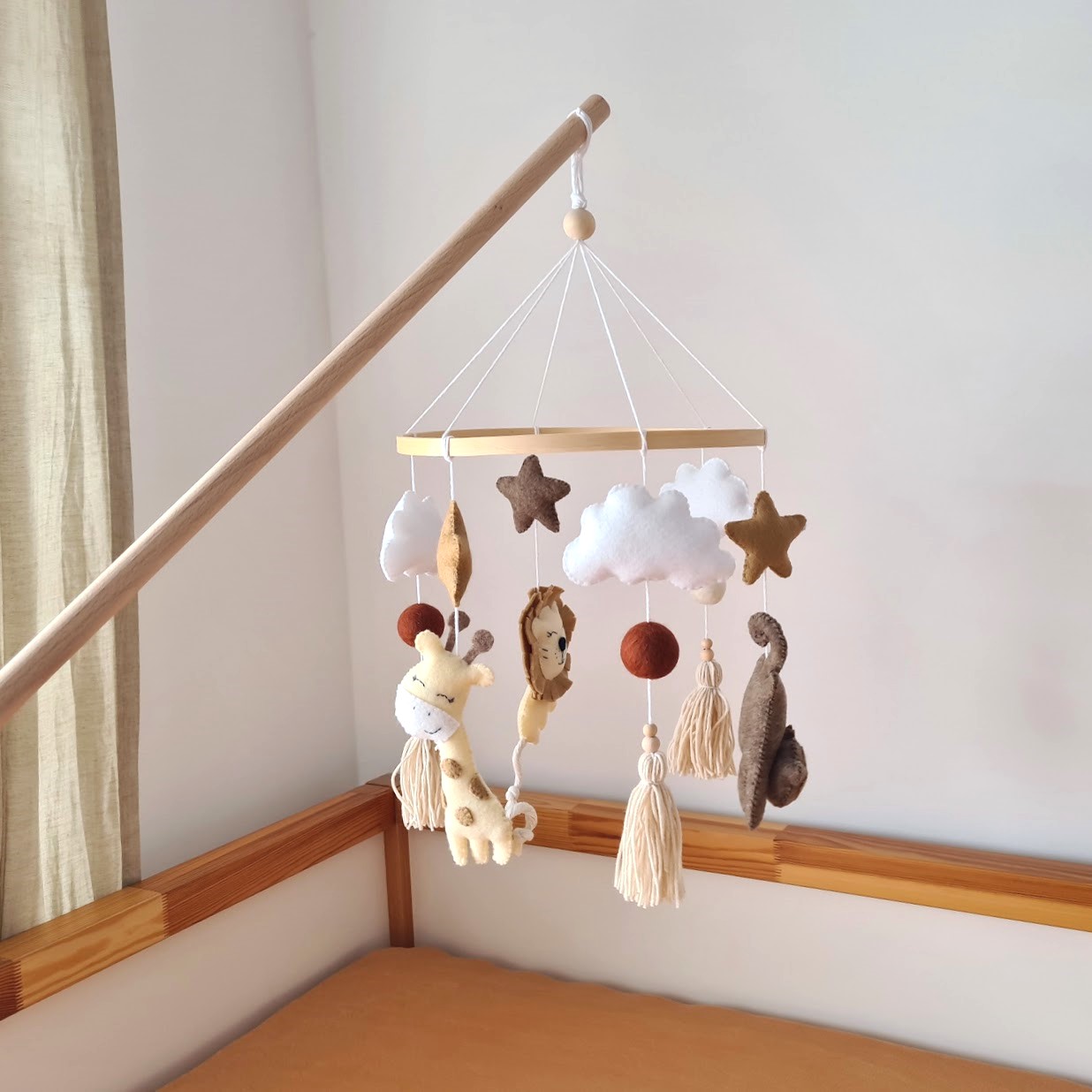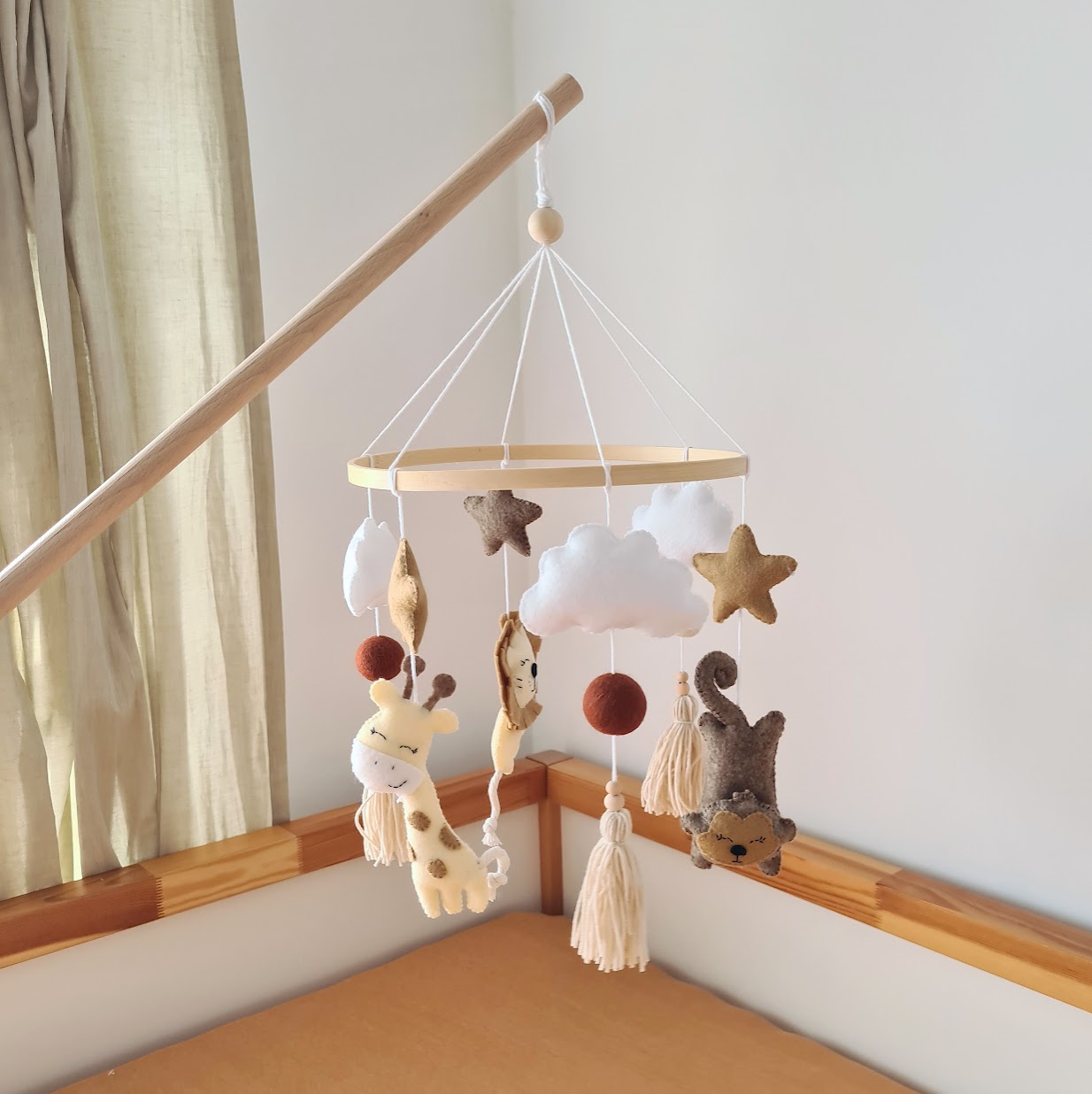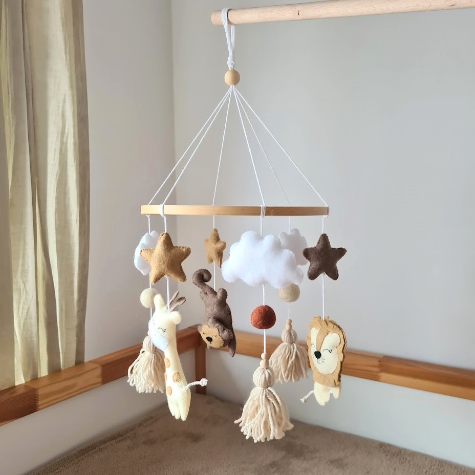 Wśród puszystych chmurek, złotych gwiazdek, filcowych kulek i miękkich frędzelków obracają się urocze filcowe zwierzątka – lew, żyrafa i małpka.