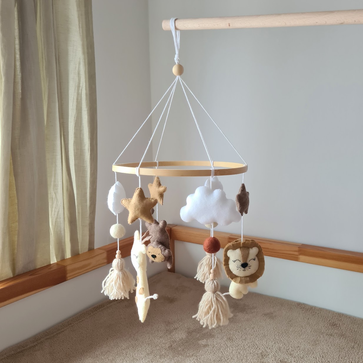 Karuzela Safari ze zwierzątkami to wyjątkowa dekoracja do pokoju niemowlęcia, która zachwyca naturalnym urokiem i ręcznym wykonaniem.