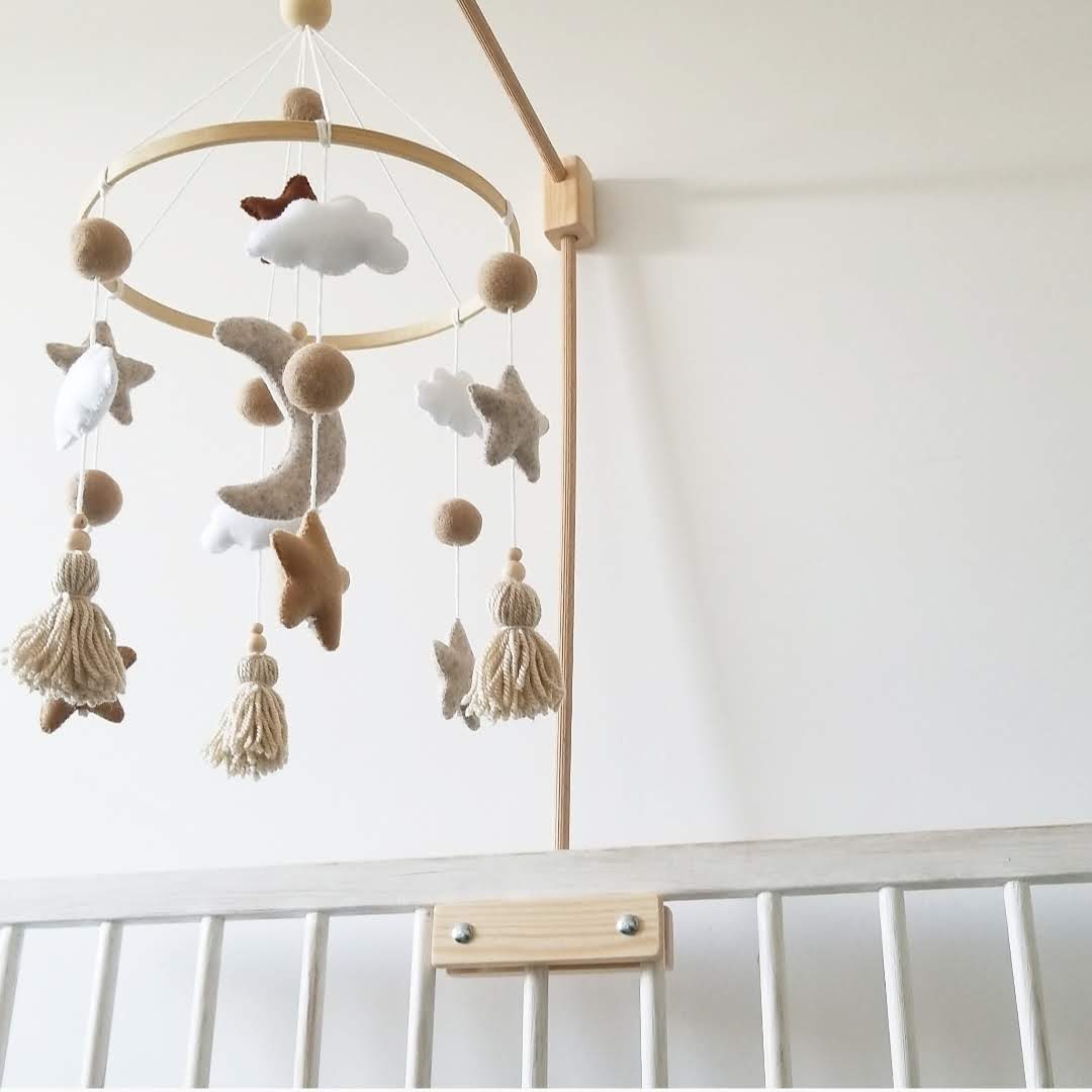 Karuzela „Księżycowa noc” to ręcznie wykonana dekoracja nad łóżeczko w odcieniach beżu i brązu z księżycem, gwiazdkami, chmurkami i wełnianymi kuleczkami. Rozwija percepcję wzrokową i wprowadza spokojny klimat do pokoju niemowlaka.