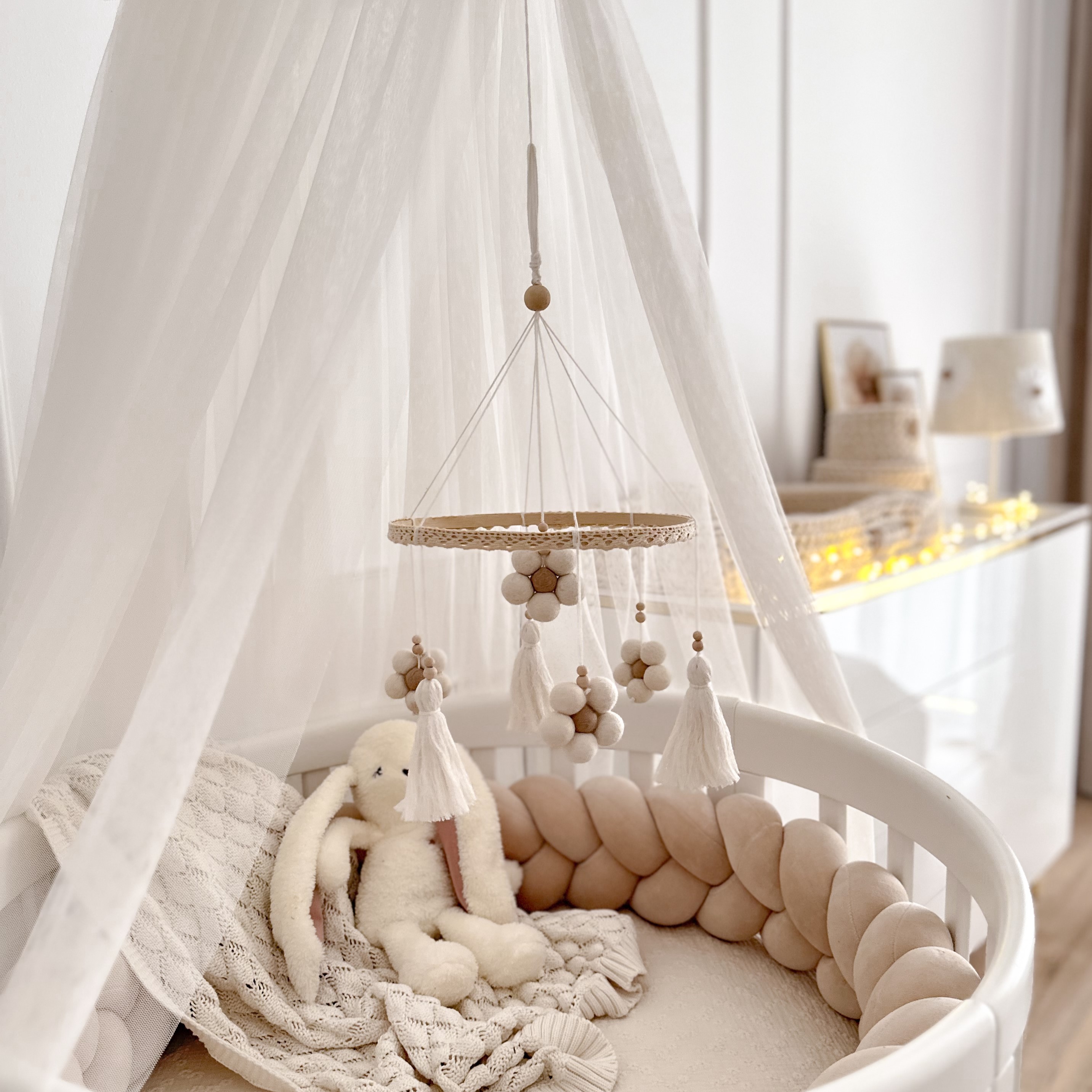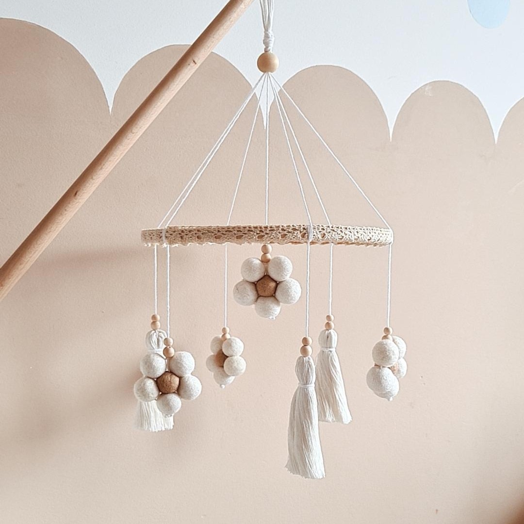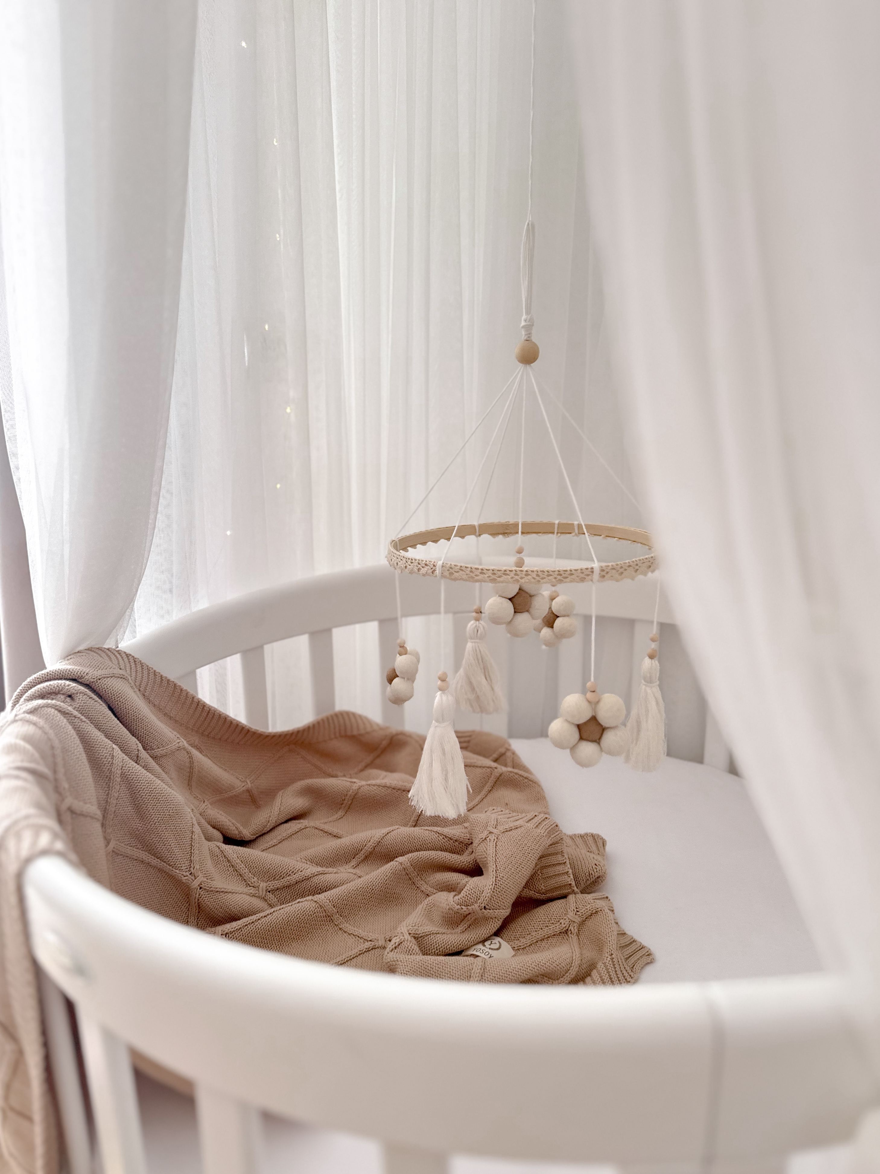 Karuzela zaprojektowana została w stylu boho minimal, dzięki czemu pasuje zarówno do klasycznych wnętrz, jak i nowoczesnych aranżacji dziecięcych.