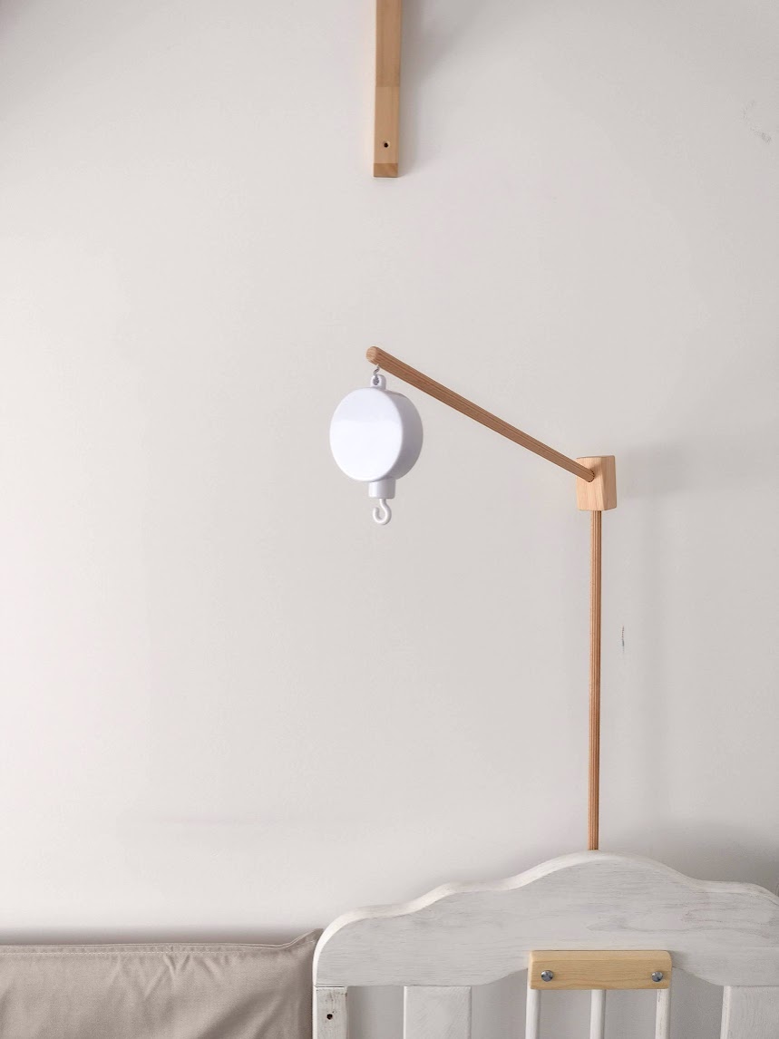 W sklepie dostępny jest drewniany uchwyt z pozytywką, idealnie dopasowany do naszych karuzel – dzięki niemu dekoracja stanie się pełnoprawną karuzelą nad łóżeczko.
