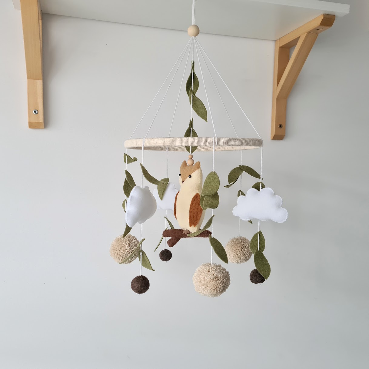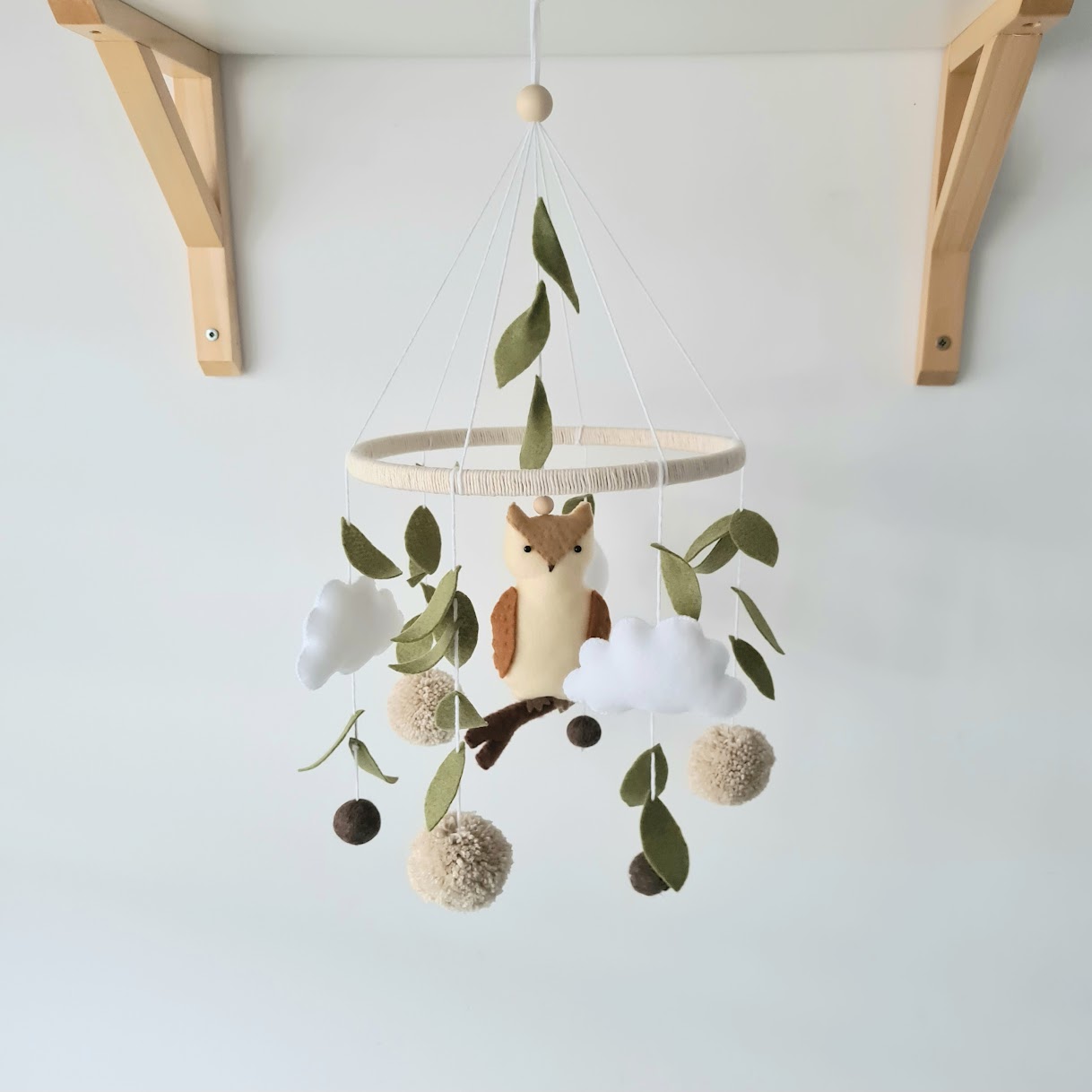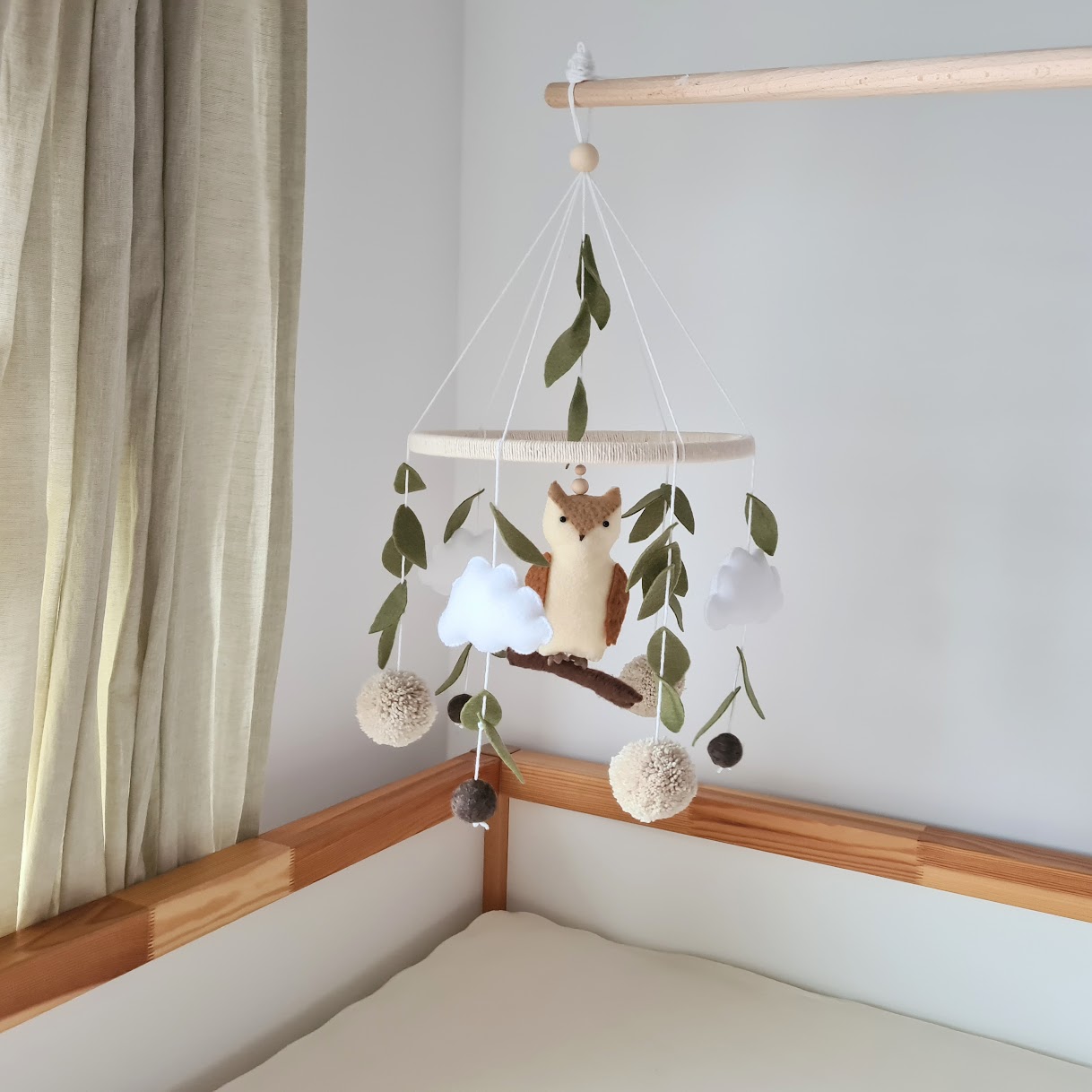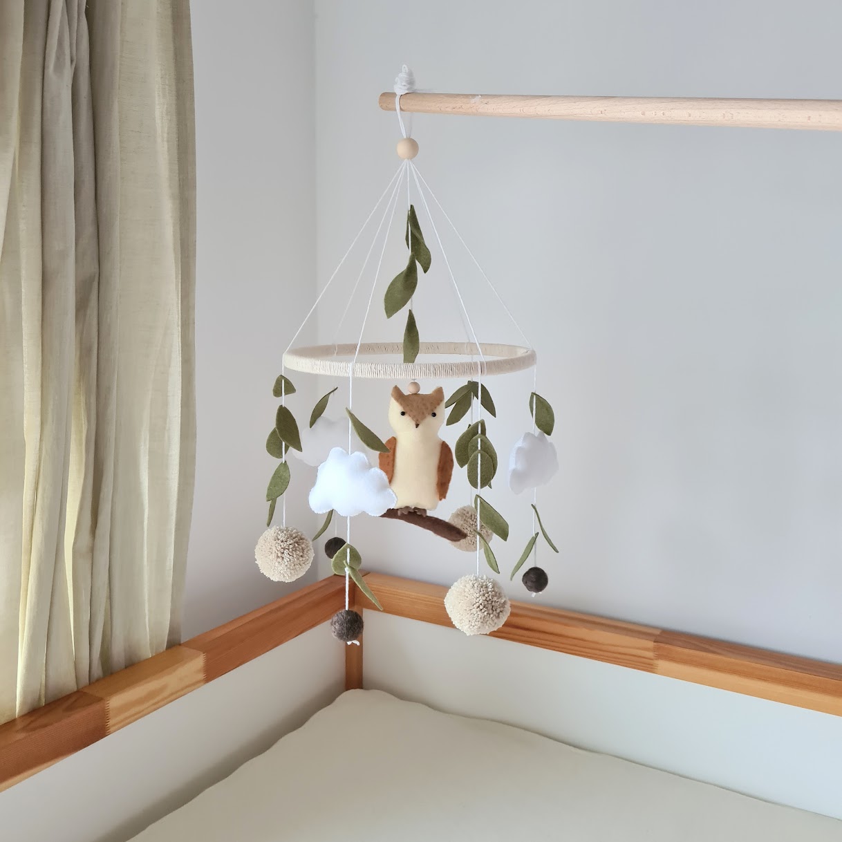 Karuzela „Sowa w lesie” to subtelna ozdoba inspirowana naturą, która wprowadza do pokoju niemowlęcia spokój i delikatność.