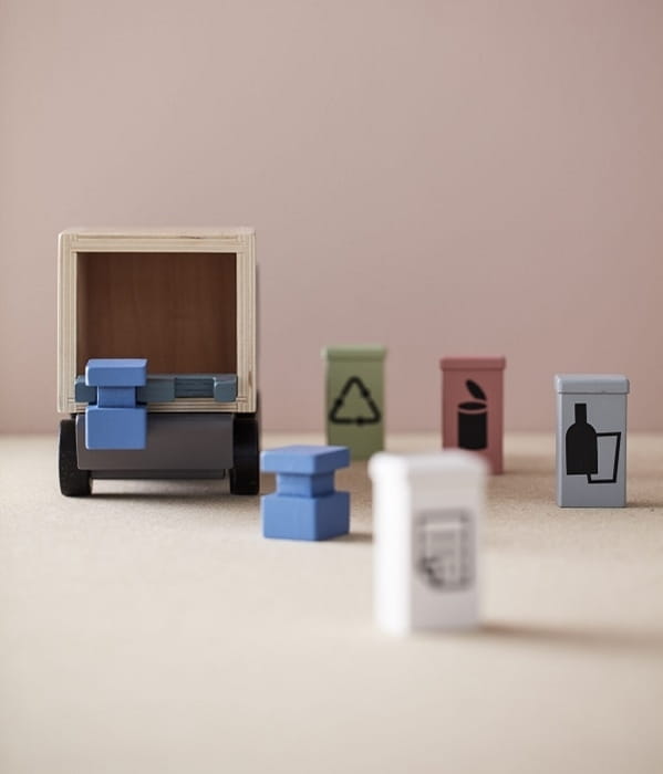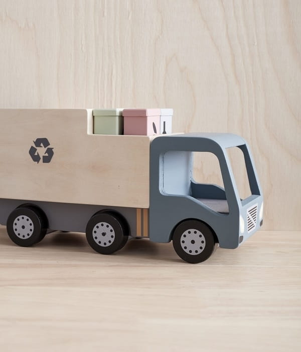 Czas na recykling! Drewniana ciężarówka na śmieci z czterema koszami sortującymi do recyklingu, zainspiruje malucha do kreatywnej zabawy. Pojemniki można umieścić na podnośniku z tyłu pojazdu. Każdy z pojemników inny symbol: papieru, szkła i metalu. Kształt i kolory sprawią, że zabawa nim będzie jednocześnie rozwijać u dziecka zdolności motoryczne, koordynację wzrokowo-ruchową oraz wyobraźnie, tworząc podczas zabawy ciekawe historie. Ciężarówka. Doskonale sprawdzi się również w roli prezentu. Produkt zgodny z aktualnymi standardami bezpieczeństwa UE.