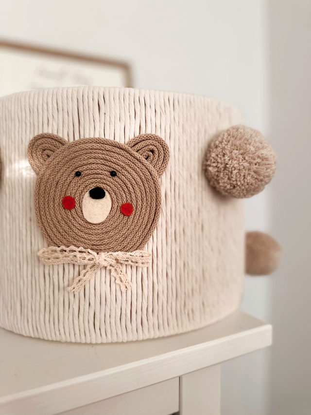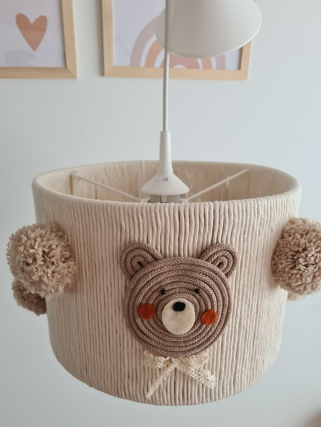 Klosz został wykonany ręcznie z makramy i filcu, co nadaje mu unikatowy, teksturowy charakter. Subtelny miś ozdabiają abażur, tworząc przytulny, dziecięcy klimat — idealny do pokoju malucha w stylu boho, skandynawskim lub naturalnym.