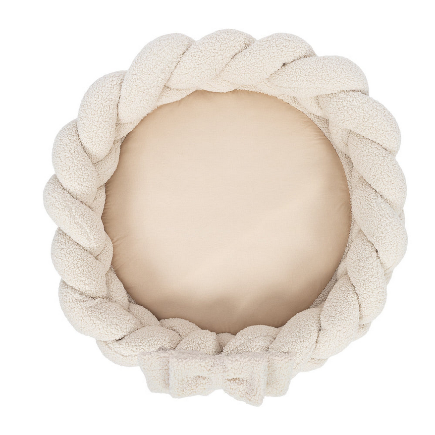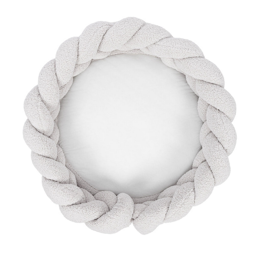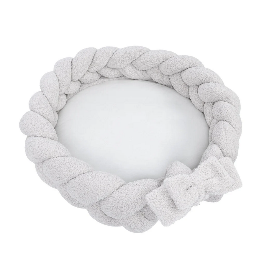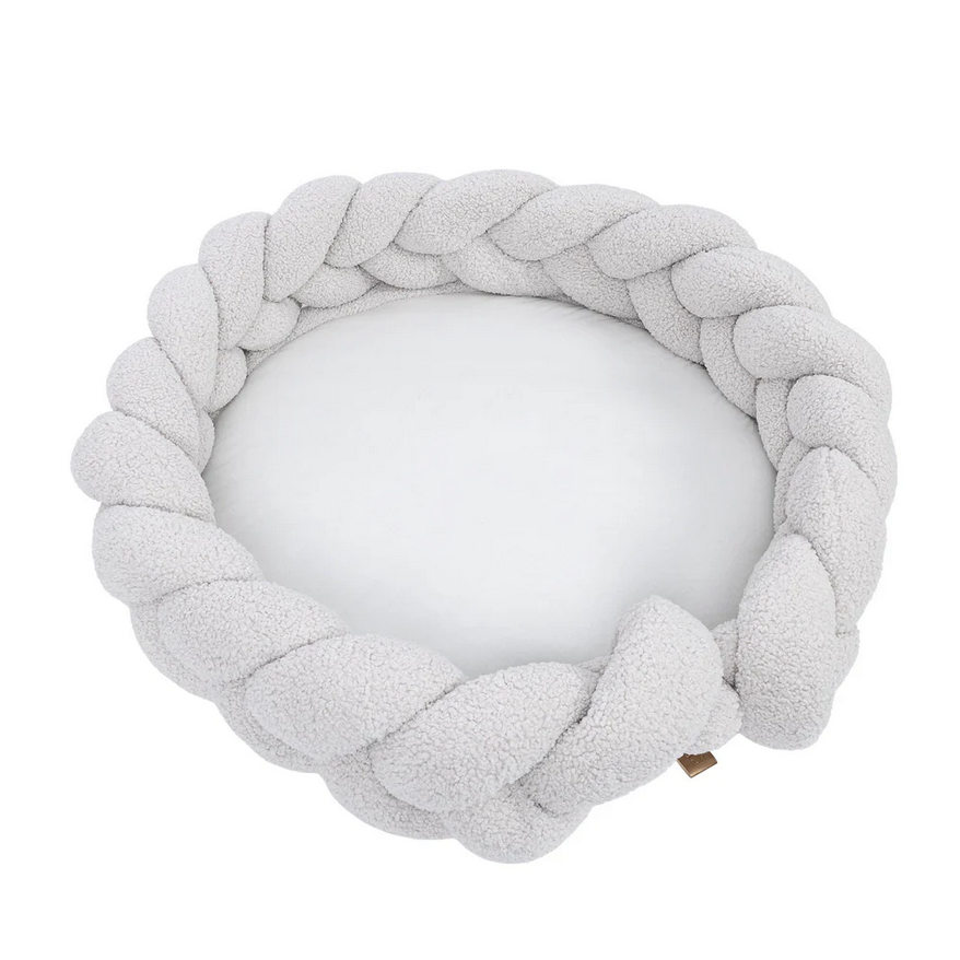 Wersja Baerly oferuje kokon z materiału "miś" — stylowy, neutralny wybór do pokoju dziecka. Materacyk połączono z warkoczem za pomocą satynowych tasiemek, co dodaje elegancji i pozwala na odczepienie wałka wraz z wiekiem dziecka.