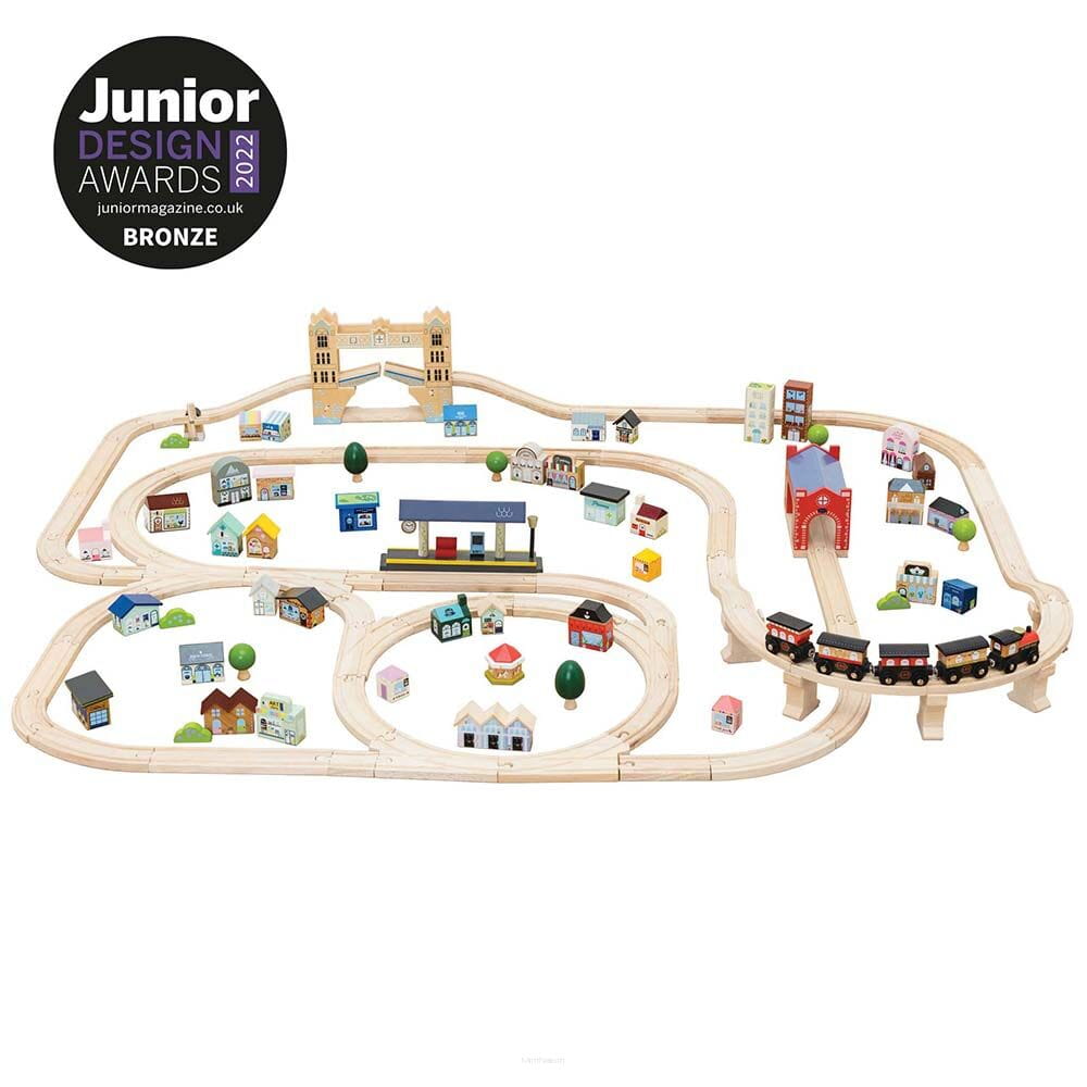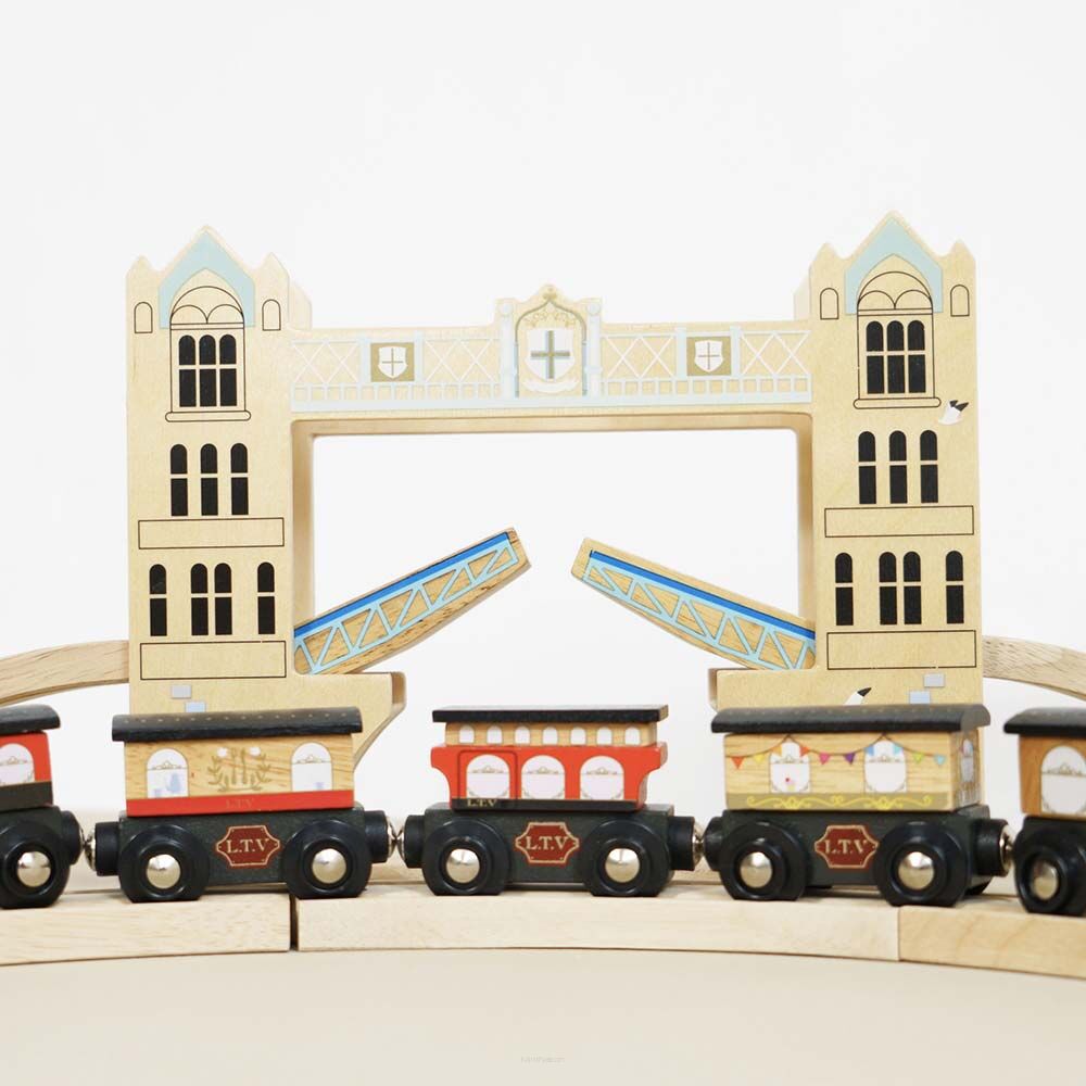 Kolejka drewniana Londyn (120 elementów) Le Toy Van – tory, pociąg, most i budynki. Edukacyjna zabawa rozwija wyobraźnię i motorykę dziecka.