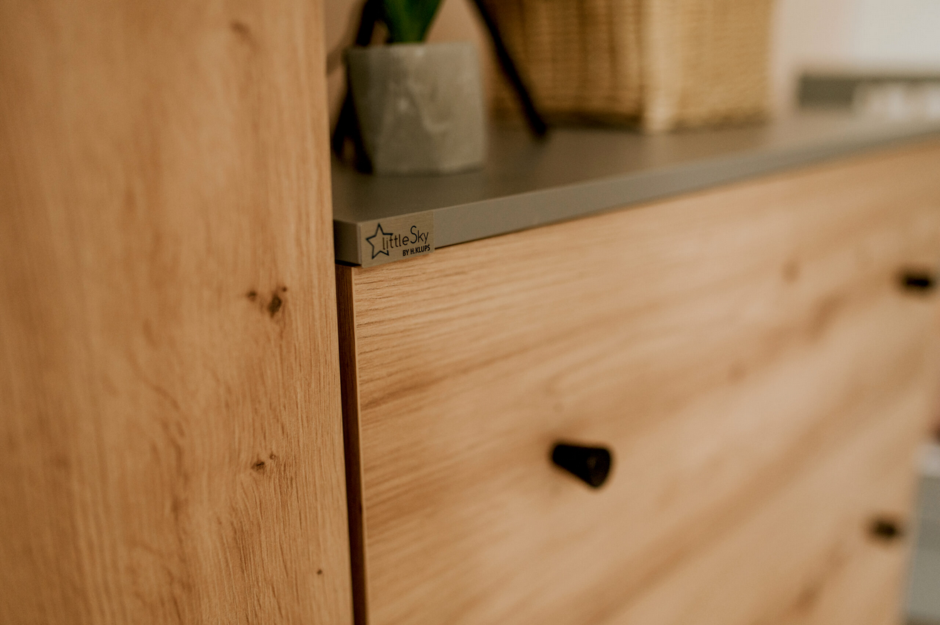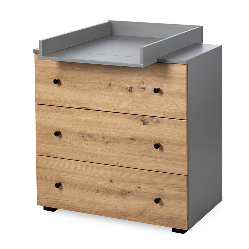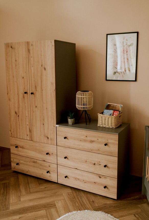 Komoda PAULINE w eleganckim połączeniu grafit + dąb to nowoczesny, pojemny i praktyczny mebel stworzony z myślą o pokoju niemowlaka i starszego dziecka. Połączenie głębokiego grafitu z ciepłem naturalnego dębu tworzy elegancki, ponadczasowy design, który idealnie wpisuje się w różnorodne aranżacje wnętrz.