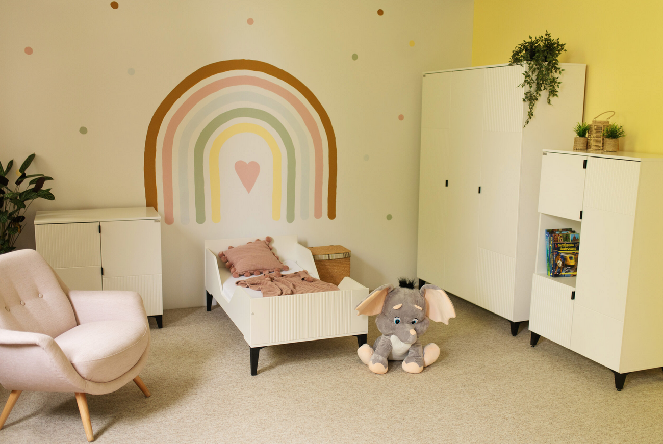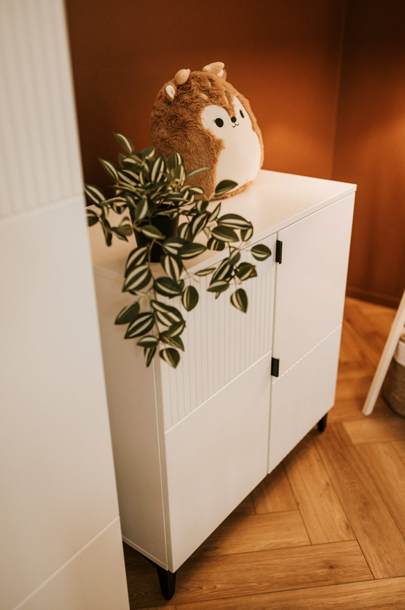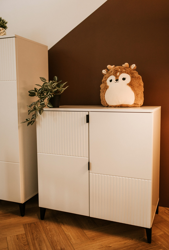 Komoda mała MIA to nowoczesny, funkcjonalny i estetyczny mebel, który doskonale sprawdzi się w pokoju niemowlaka i starszego dziecka. Projekt mebla łączy ponadczasowy styl z praktycznymi rozwiązaniami, ułatwiającymi codzienną organizację ubrań, pieluszek, akcesoriów i innych drobiazgów. Komoda cechuje się subtelnym designem z ryflowanymi frontami i kontrastującymi nóżkami, który wpisuje się zarówno w nowoczesne, jak i klasyczne aranżacje wnętrz.