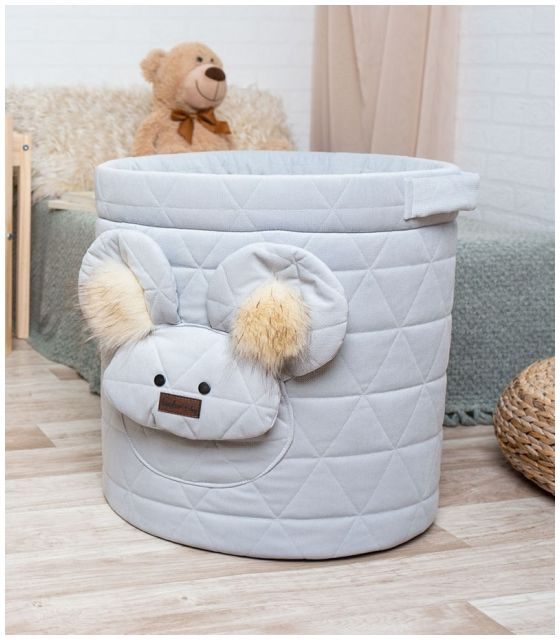 Kosz wykonany jest z przyjemnego w dotyku materiału Minky, który dostępny jest w kilku kolorach oraz pikowaniach.