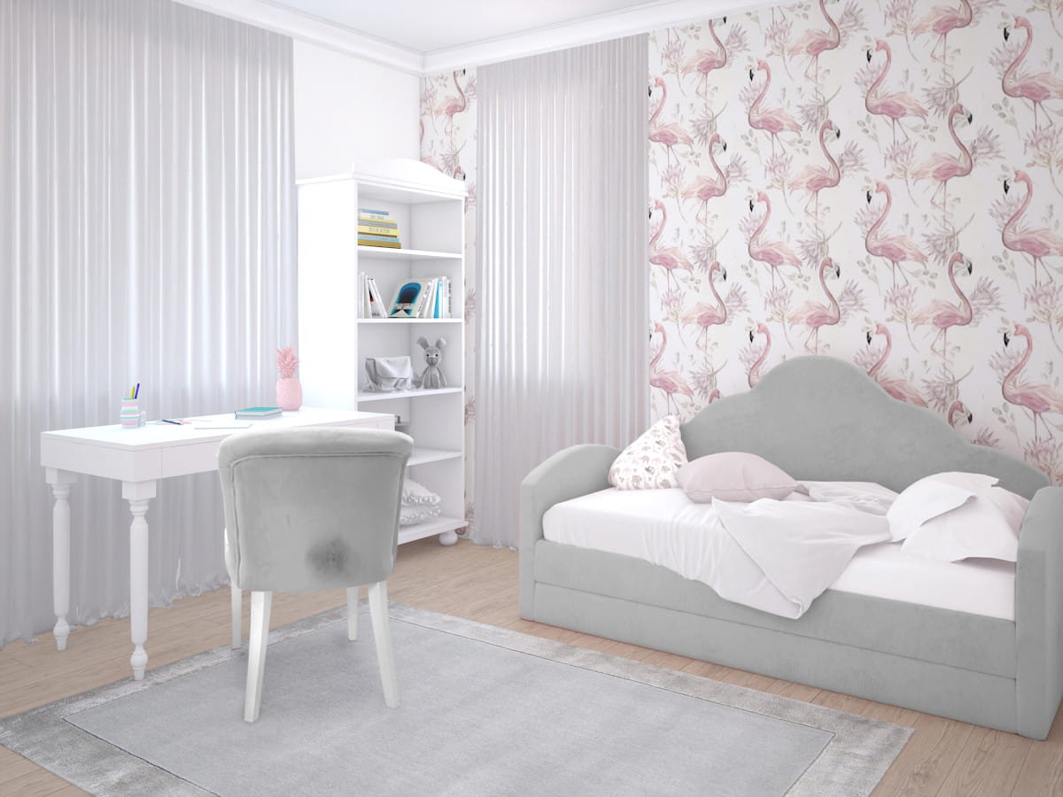 Kolorystyka: pudrowy róż, błękit, szarość.