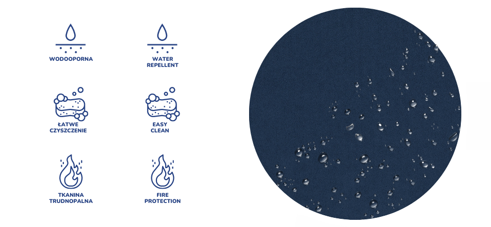 Tkanina przeszła test zapalności zgodnie z normą EN1021-1 WATER REPELLEND - Tkanina VELVET pokryta jest specjalną warstwą ochronną, tworząca hydrofobową powłokę zabezpieczającą przed szybkim przesiąkaniem płynów. Zapobiega to natychmiastowemu absorbowaniu wody przez tkaninę, sprawiając że ciecz skrapla się na powierzchni materiału.