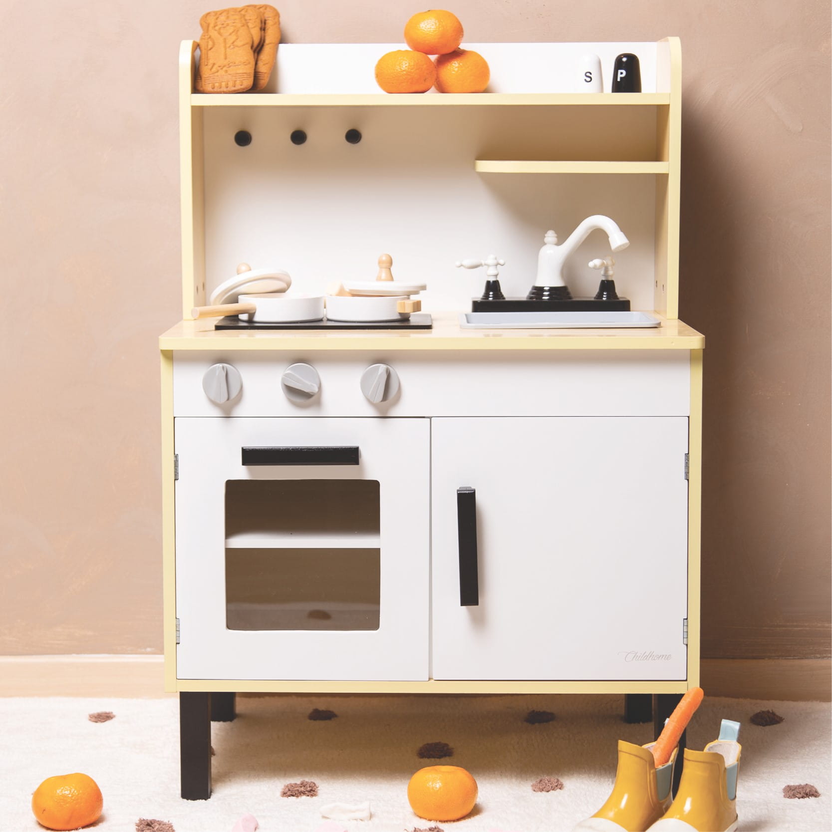 W skład zestawu wchodzą garnek, patelnia, solniczka, pieprzniczka, wbudowany piekarnik z gałkami oraz lodówka - wszystko czego potrzeba aby przygotować swoje pierwsze przepyszne danie.