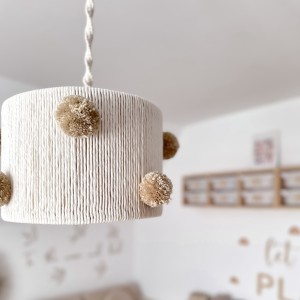 Ręcznie wykonany klosz z makramy i bawełnianej włóczki ozdobiono uroczymi pomponami, które nadają lampie wyjątkowy, dziecięcy charakter.