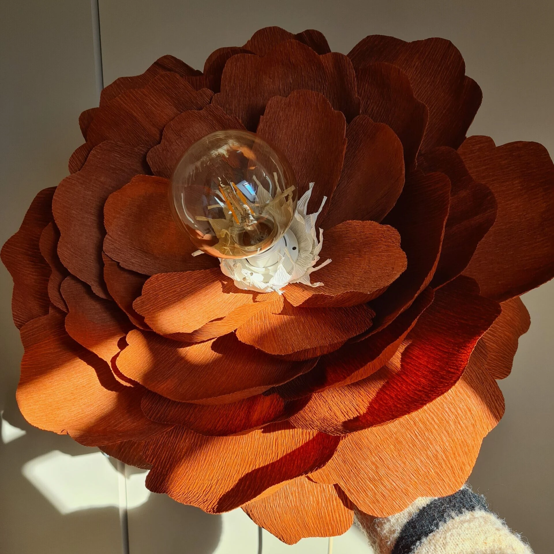 Lampa wisząca Peonia w kolorze terakota to ręcznie wykonana dekoracyjna lampa do pokoju dziecięcego. Klosz w kształcie kwiatu zapewnia miękkie, przytulne światło, idealne do zabawy i odpoczynku. Doskonała jako lampa boho dla dzieci, do pokoju dziewczynki i chłopca.