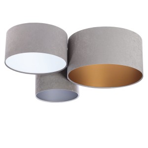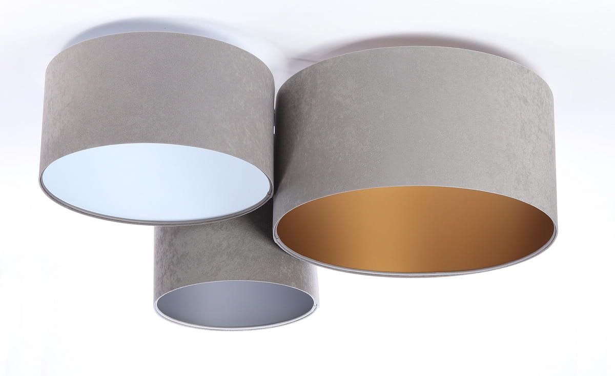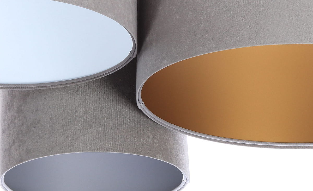 Lampa składa się z kombinacji trzech abażurów, każdy o innej średnicy i wysokości, co w połączeniu tworzy ciekawy układ. Abażury wykonane są z tworzywa sztucznego, pokrytego tkaniną welurową. Wnętrze abażura to biała, srebrna lub złota folia, która w podświetleniu daje piękny poblask. Oprawa na 3 żarówki z łatwością rozświetli każde wnętrze. Abażury są odporne na działania promieni UV, tkanina nie ulega blaknięciu w trakcie użytkowania. Abażury wewnątrz można wyczyścić za pomocą wilgotnej ściereczki, natomiast powierzchnie welurowe można odkurzyć przy użyciu rolki czyszczącej do ubrań. Lampa wyprodukowana jest ręcznie. Jest to w całości polska produkcja.