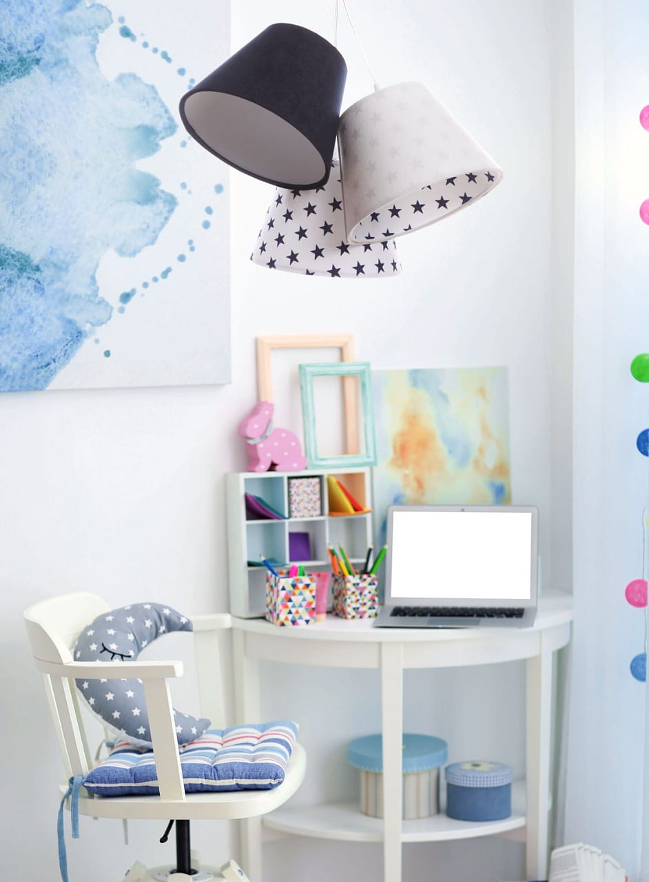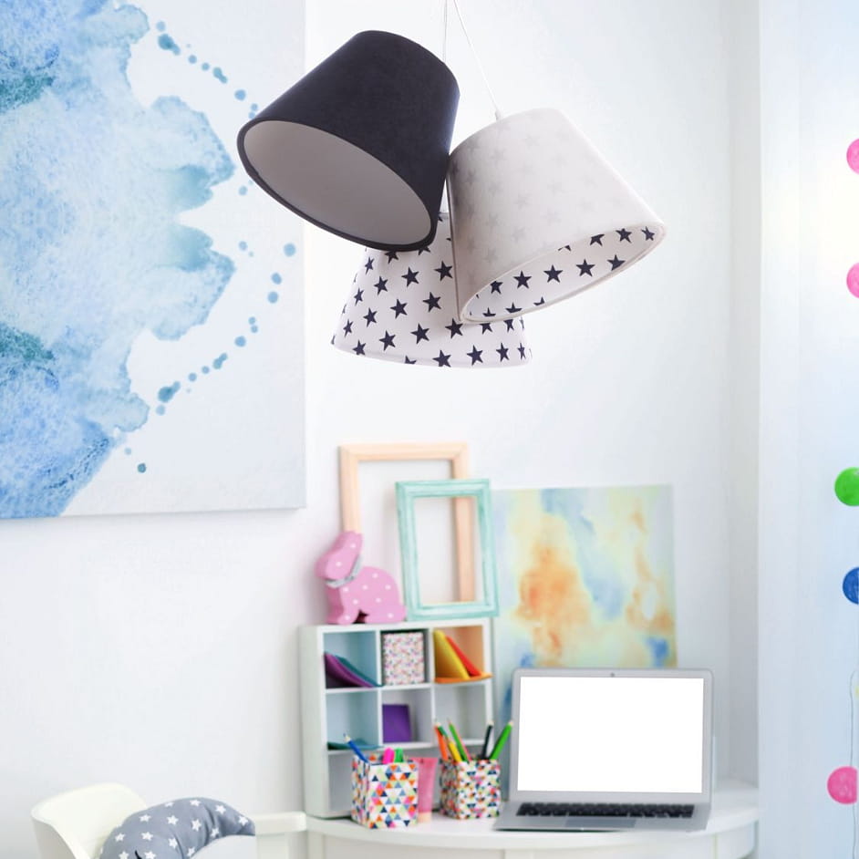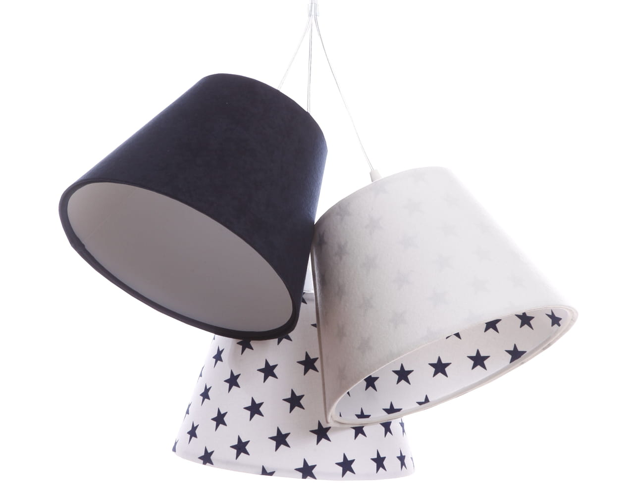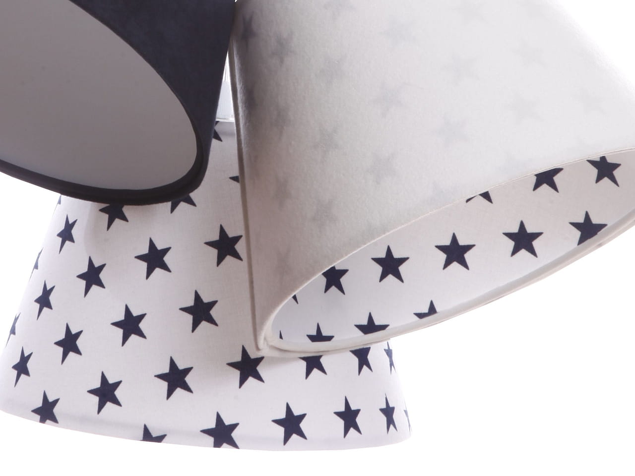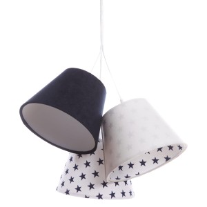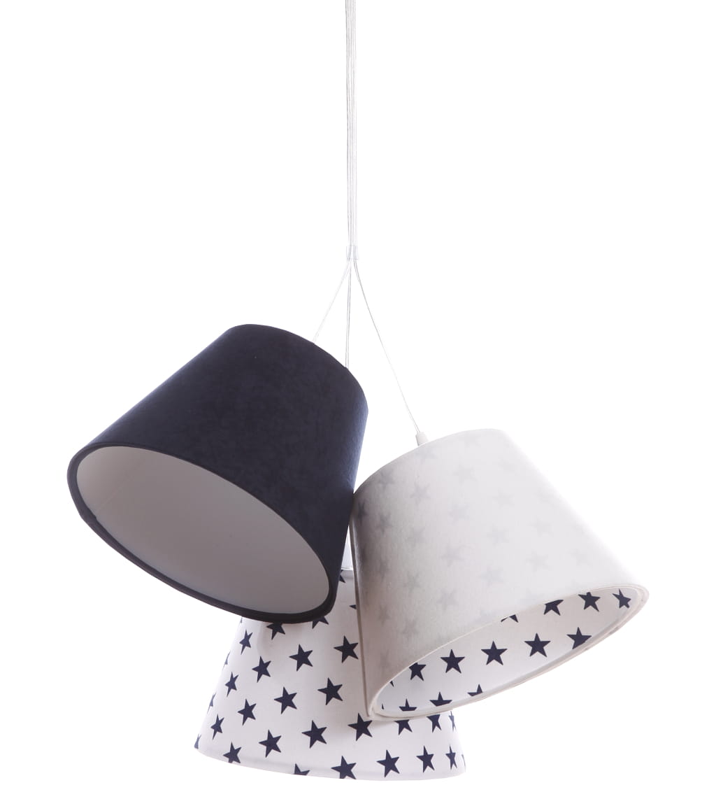 Potrójna lampa Lena wykonana jest z tkaniny welurowej w kolorze białym i granatowym. Każdy abażurek udekorowany jest mocą delikatnych gwiazdek. Wnętrze abażura to biała apla, w odcieniu matowym.