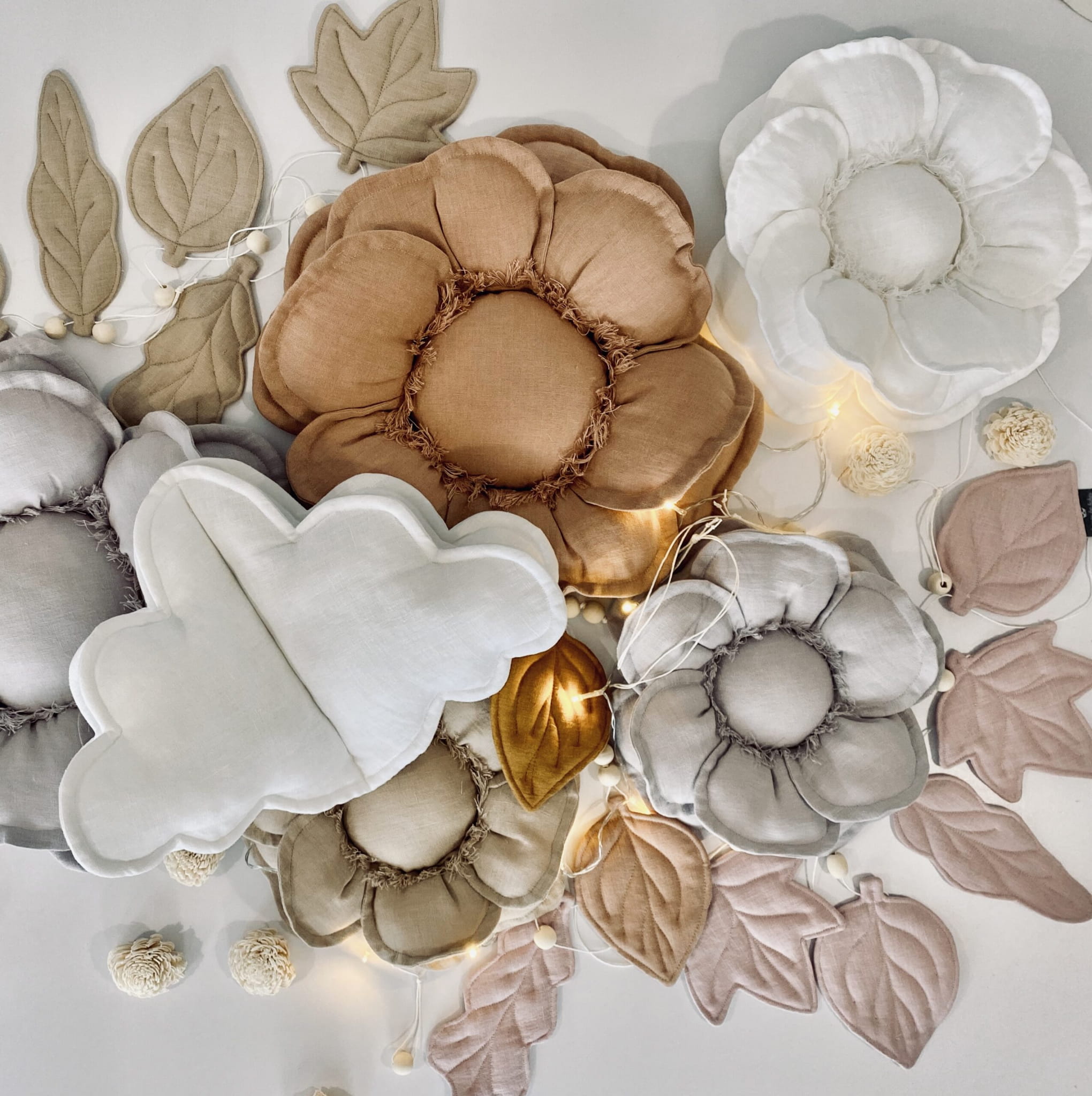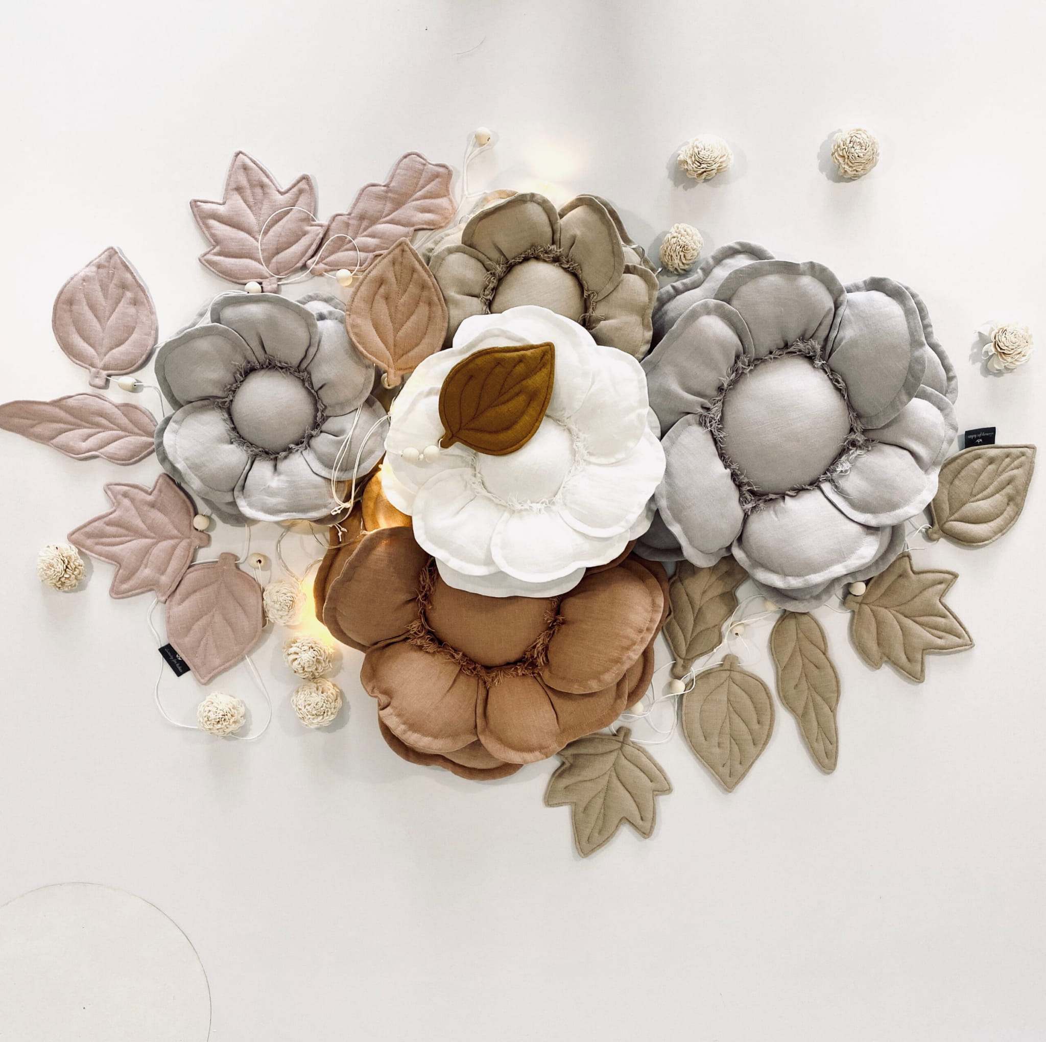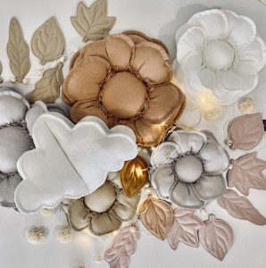 Lniany kwiatek dekoracyjny w kolorze szarym to ręcznie szyta ozdoba ścienna wykonana ze 100% naturalnego lnu z antyalergicznym wypełnieniem. Doskonale pasuje do pokoju dziecka, sypialni lub salonu, wprowadzając spokojny klimat w stylu boho i skandynawskim.