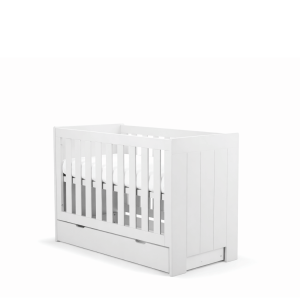 Łóżeczko niemowlęce Calmo 60x120 cm Białe – regulowane łóżko dziecięce z wyjmowanymi szczebelkami i możliwością montażu szuflady. Bezpieczne i trwałe, od Pinio.