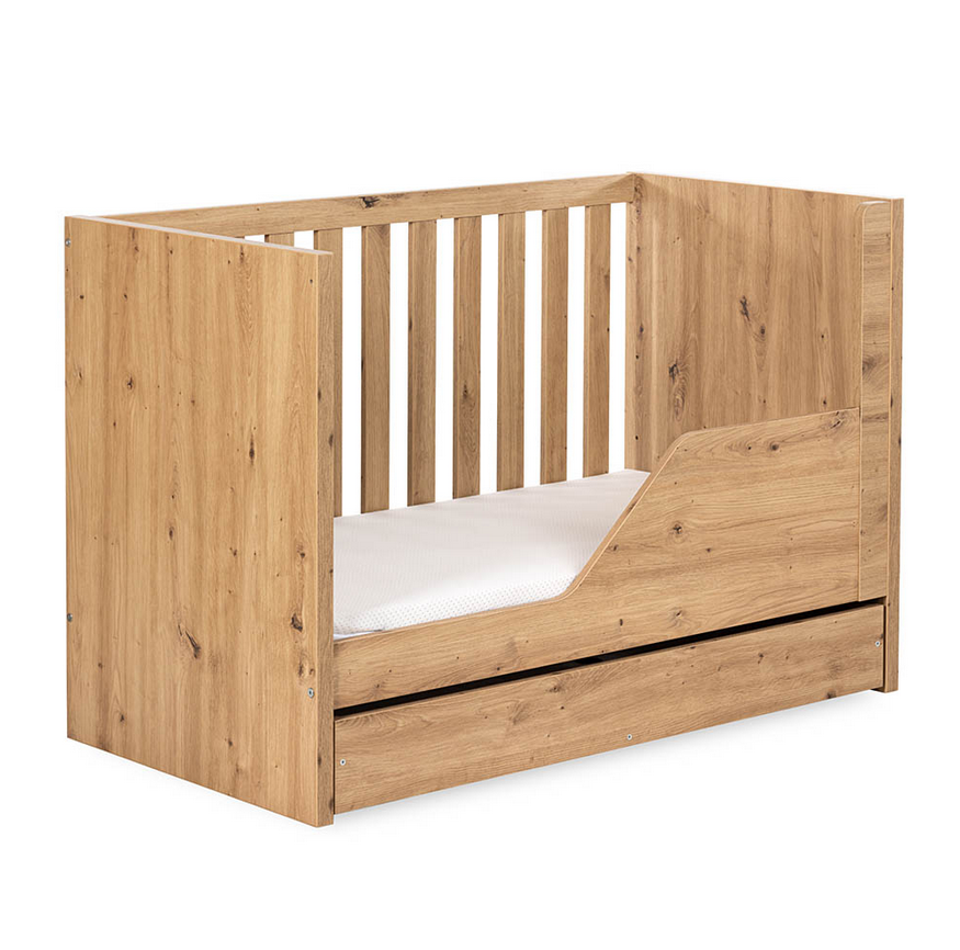 – Opcjonalna barierka – idealna, gdy dziecko zaczyna się bardziej poruszać lub jako pierwszy krok w stronę większego łóżka.