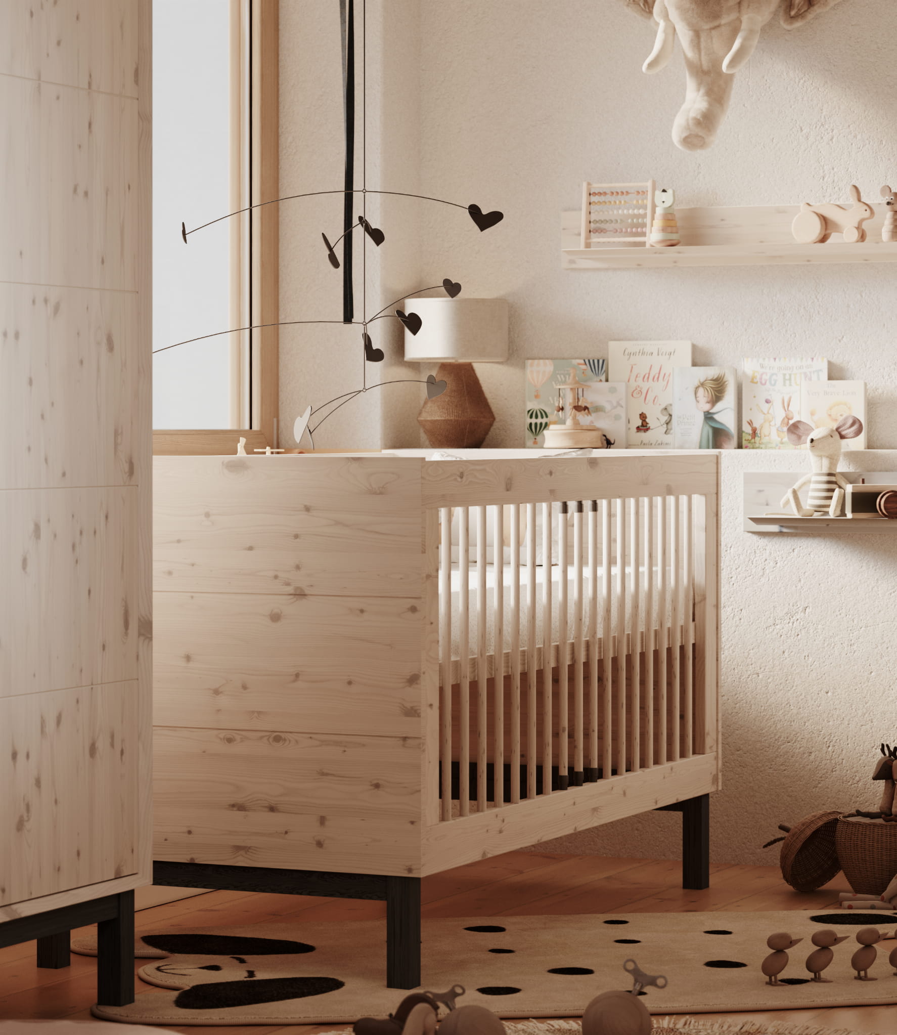 - Wysokość nóżek: Nóżki o wysokości 20 cm (z czego 15,5 cm to przestrzeń netto pod meblem) zapewniają stabilność i umożliwiają łatwe utrzymanie czystości pod łóżeczkiem.