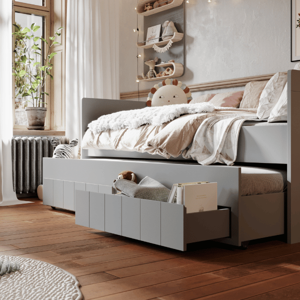 Łóżko dziecięce z wysuwem Calmo to doskonałe rozwiązanie dla rodzin, które cenią praktyczne wykorzystanie przestrzeni. Wysuwana szuflada może pełnić funkcję dodatkowego łóżka, a także miejsca do przechowywania pościeli lub zabawek.