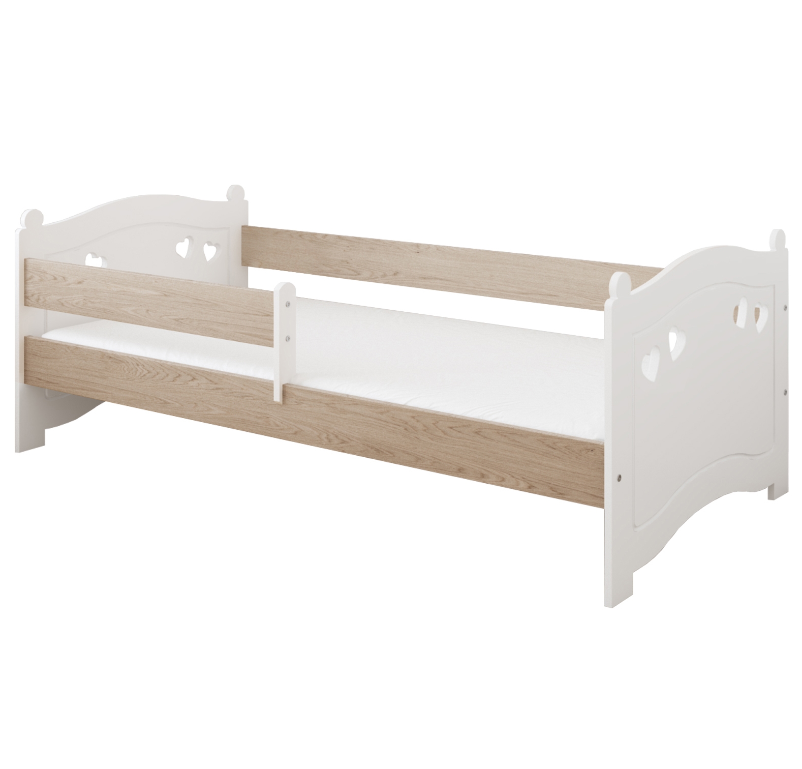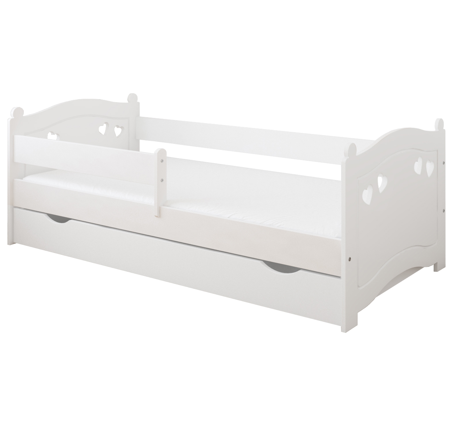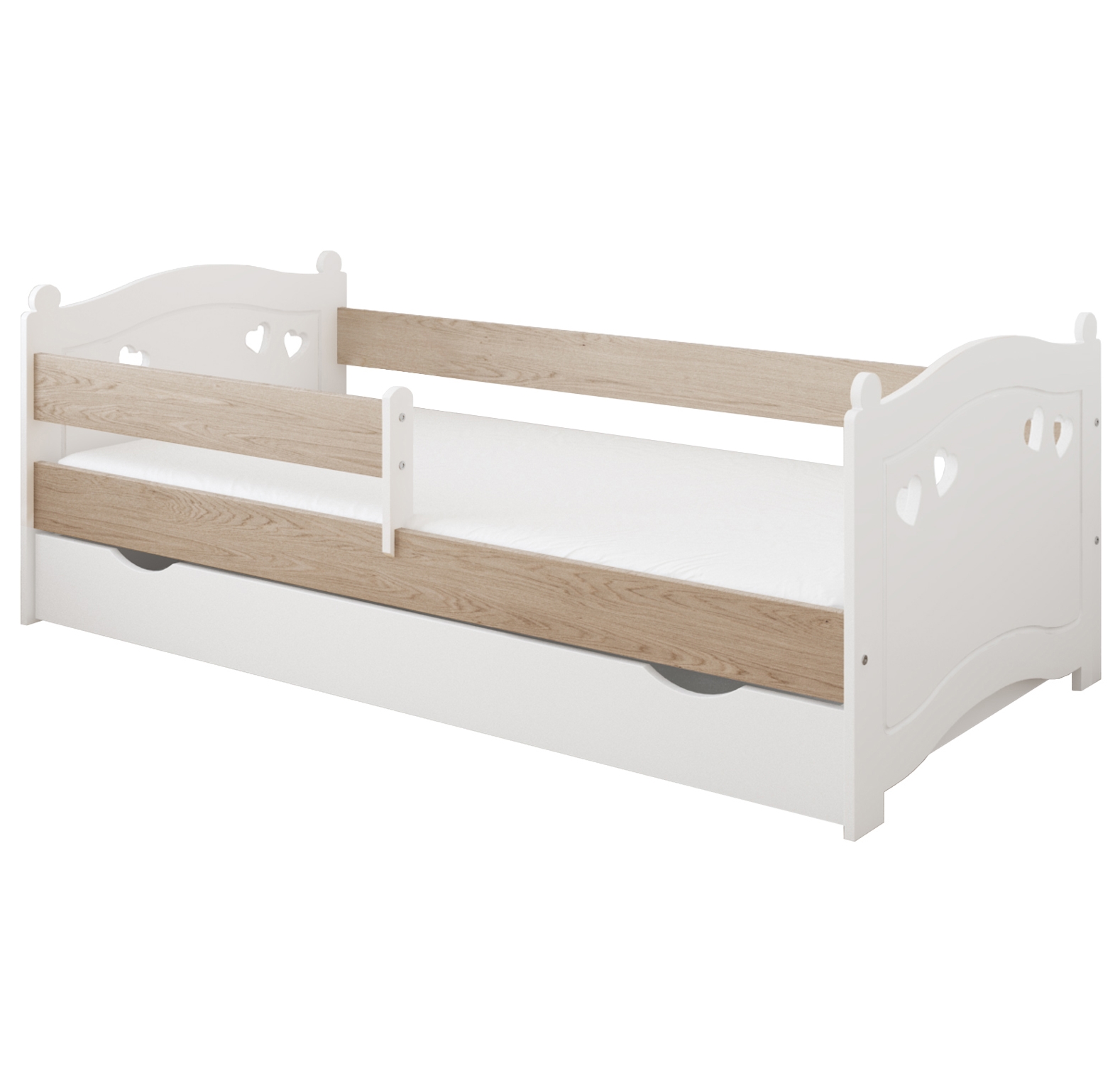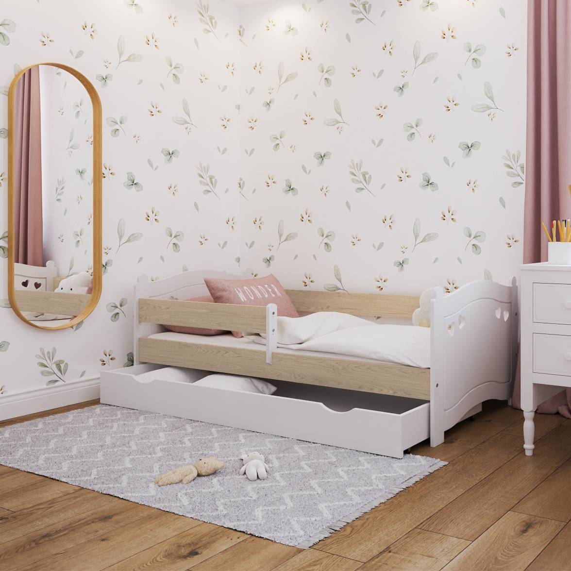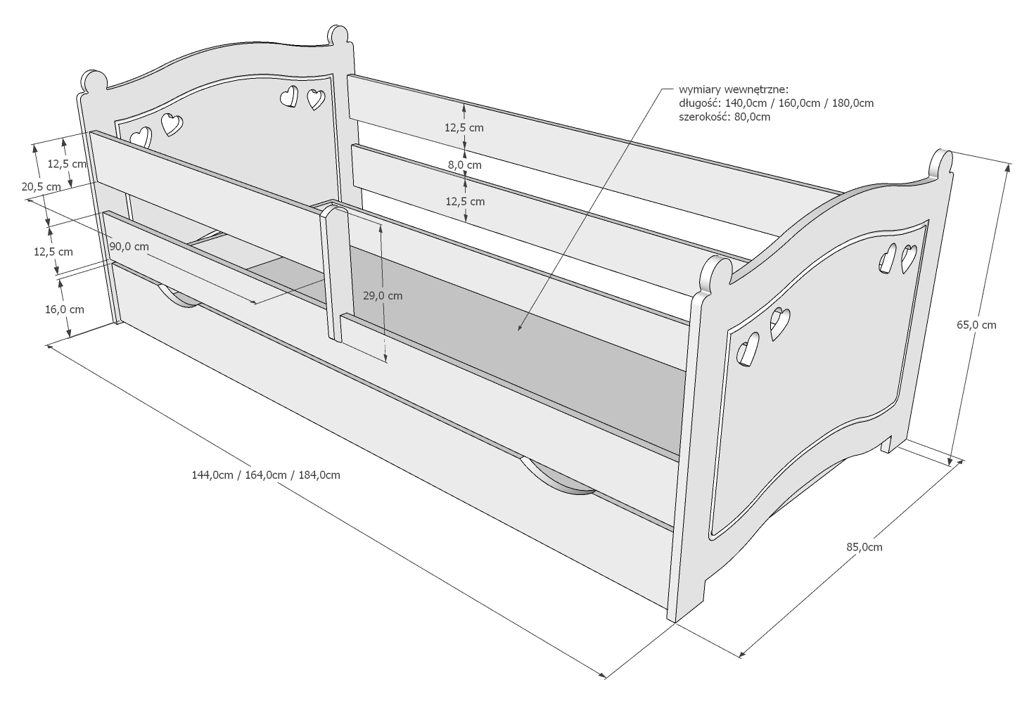 Drewniane łóżko dziecięce Sweet Love z barierką to bezpieczne i wygodne łóżko stworzone z myślą o najmłodszych. Urocze wycięcia w kształcie serduszek nadają mu wyjątkowego charakteru, dzięki czemu idealnie pasuje do pokoju dziewczynki. Niska konstrukcja ułatwia dziecku samodzielne wchodzenie do łóżka, a boczne barierki chronią przed wypadnięciem podczas snu. W zestawie znajduje się miękki materac piankowy oraz praktyczna szuflada na pościel lub zabawki. Solidna konstrukcja zapewnia stabilność i wytrzymałość do 100 kg, dzięki czemu łóżko posłuży dziecku przez długi czas.