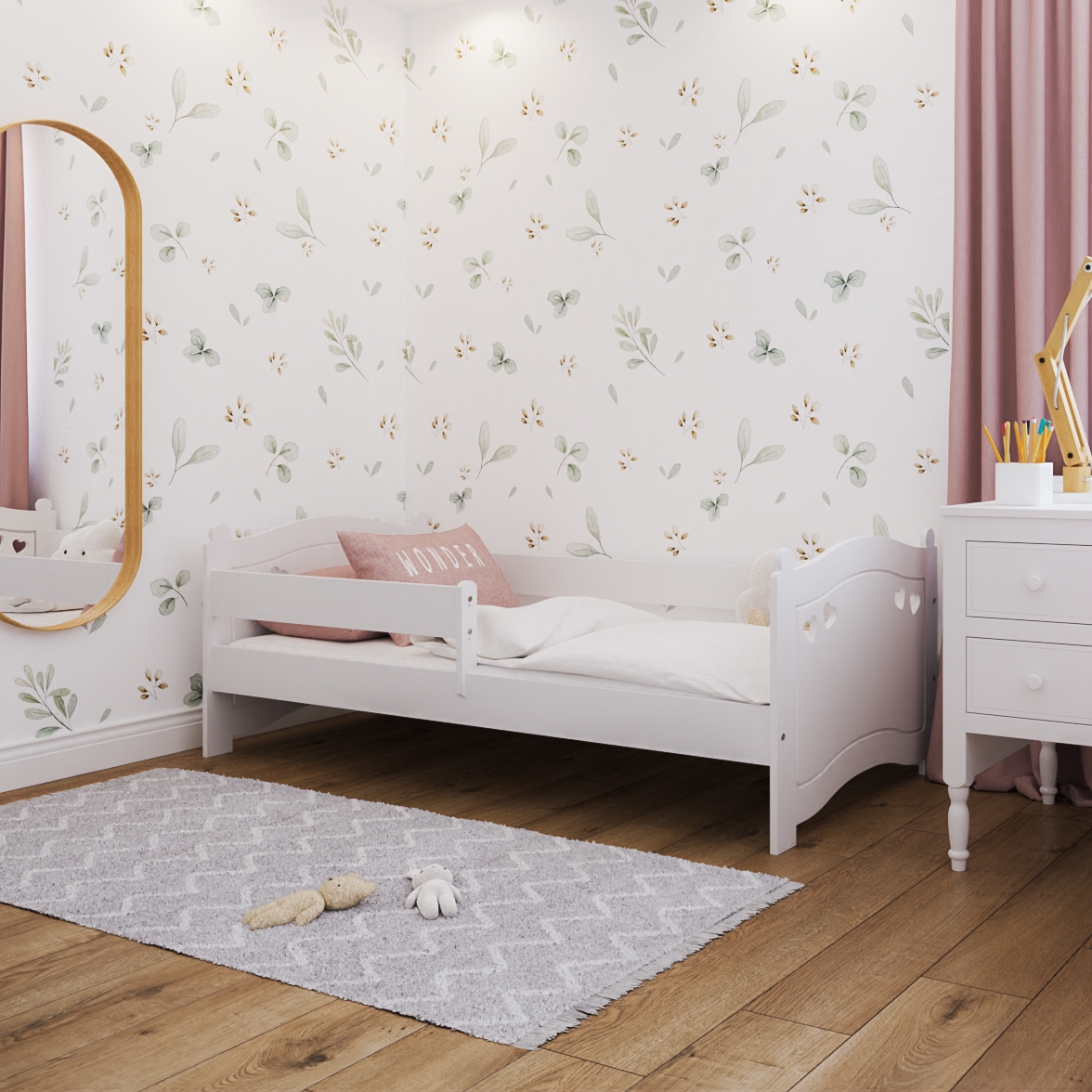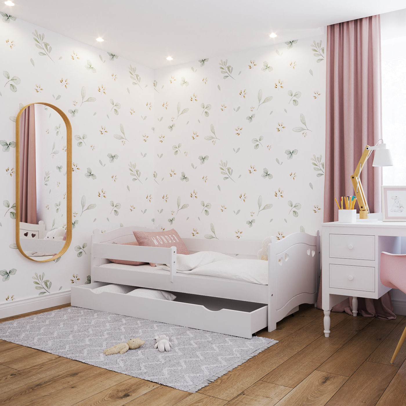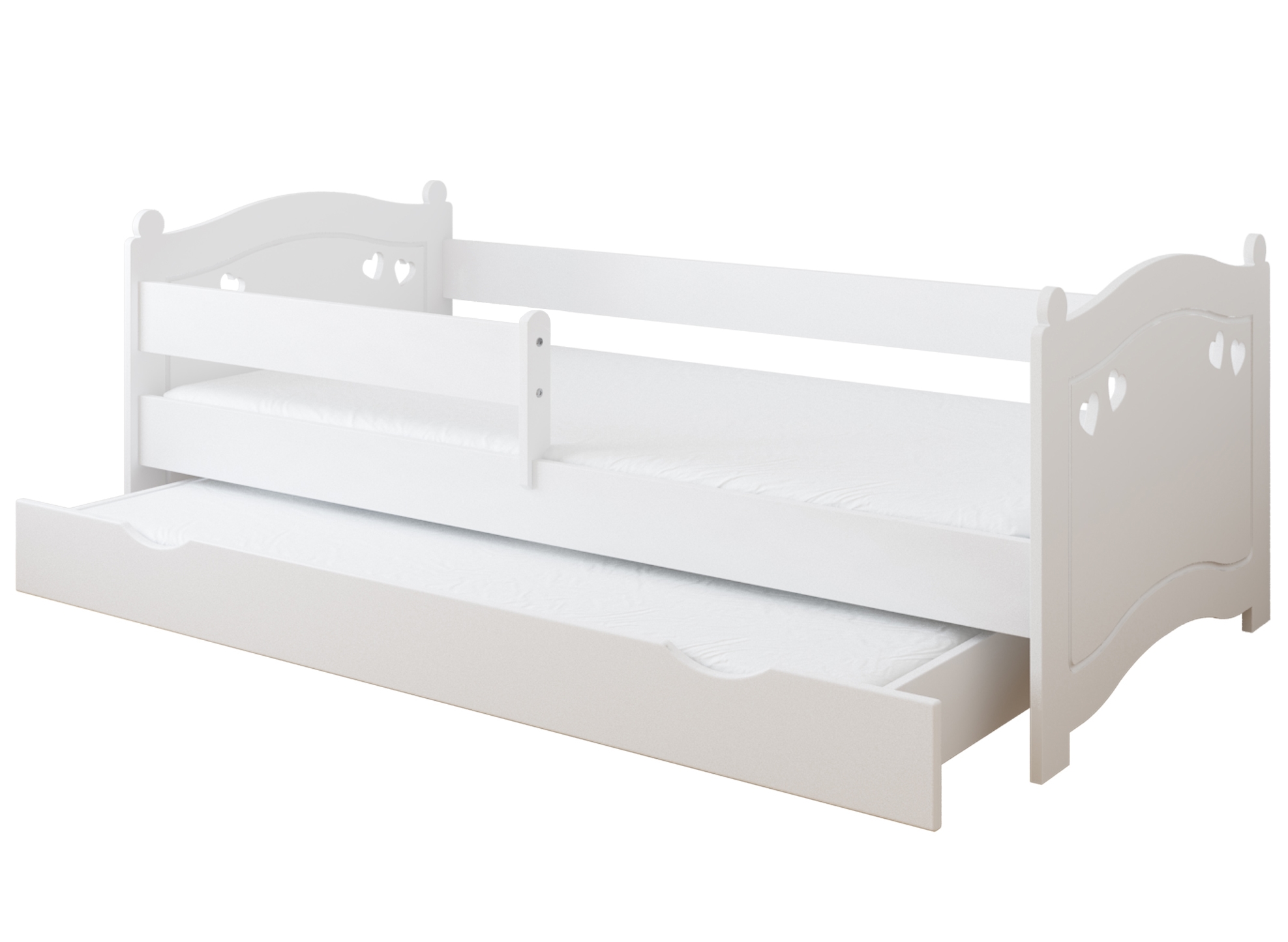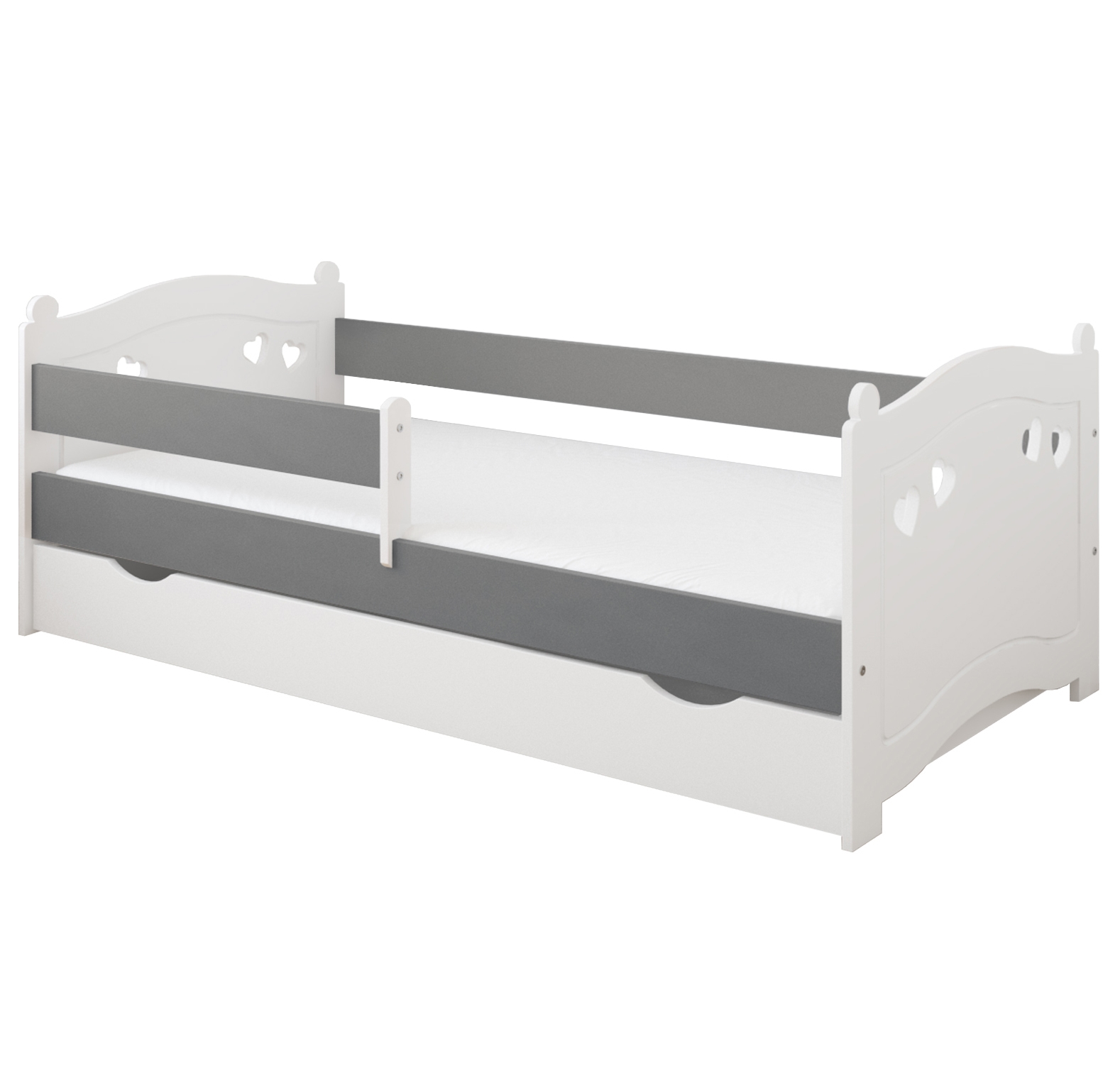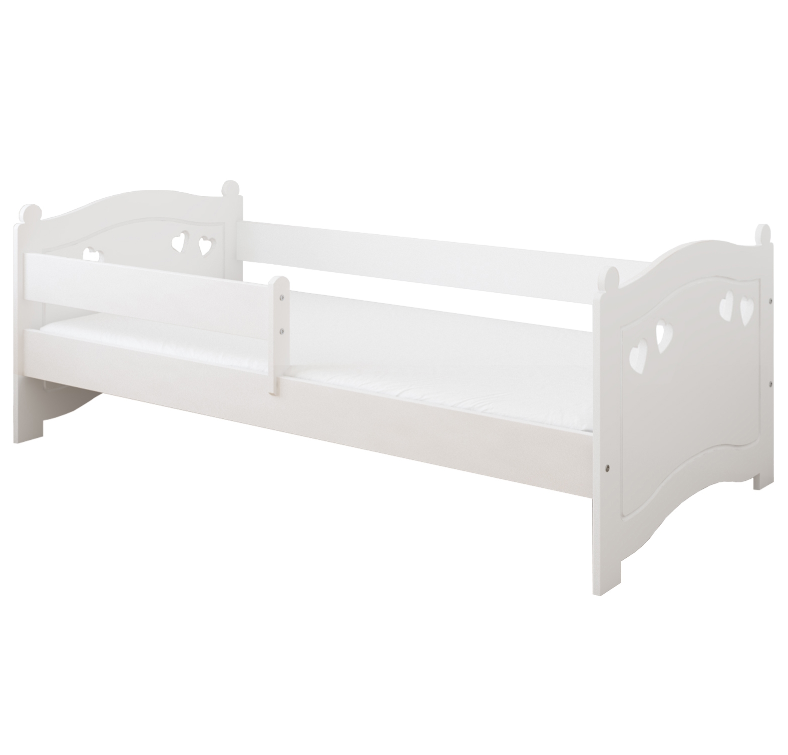 Drewniane łóżko dziecięce Sweet Love z barierką to bezpieczne i wygodne łóżko stworzone z myślą o najmłodszych. Urocze wycięcia w kształcie serduszek nadają mu wyjątkowego charakteru, dzięki czemu idealnie pasuje do pokoju dziewczynki. Niska konstrukcja ułatwia dziecku samodzielne wchodzenie do łóżka, a boczne barierki chronią przed wypadnięciem podczas snu. W zestawie znajduje się miękki materac piankowy oraz praktyczna szuflada na pościel lub zabawki. Solidna konstrukcja zapewnia stabilność i wytrzymałość do 100 kg, dzięki czemu łóżko posłuży dziecku przez długi czas.