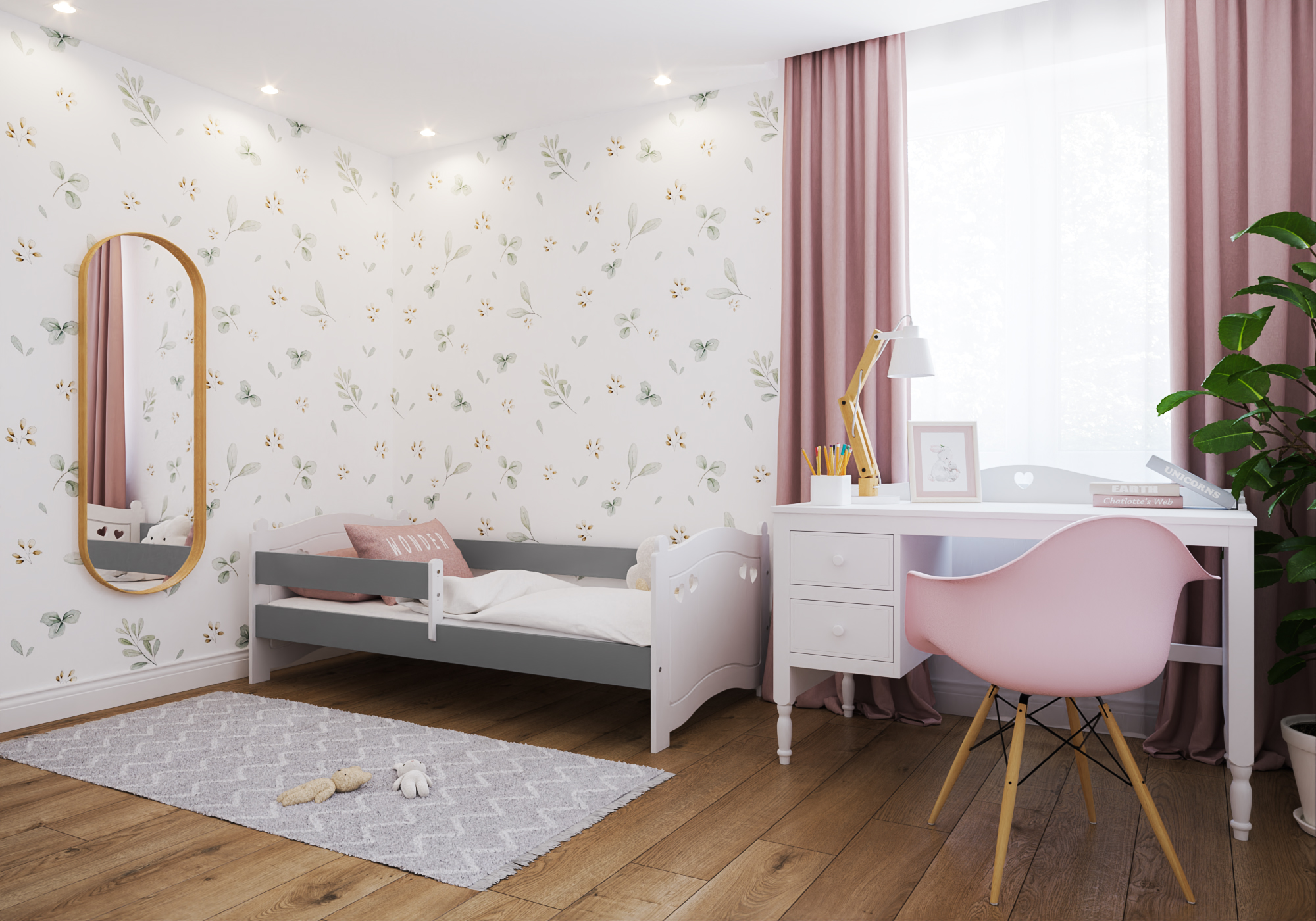 Urocze wycięcia w kształcie serduszek nadają łóżku wyjątkowego charakteru i sprawiają, że doskonale pasuje do aranżacji pokoju dziewczynki. Stylowy design łączy funkcjonalność z estetyką, dzięki czemu łóżko jest nie tylko praktycznym meblem, ale również piękną dekoracją dziecięcego wnętrza.