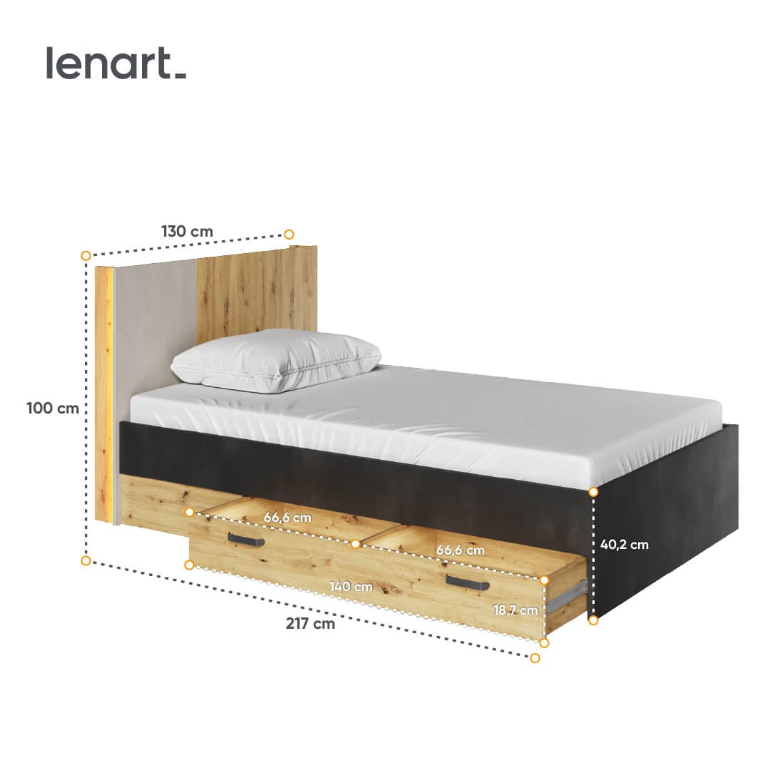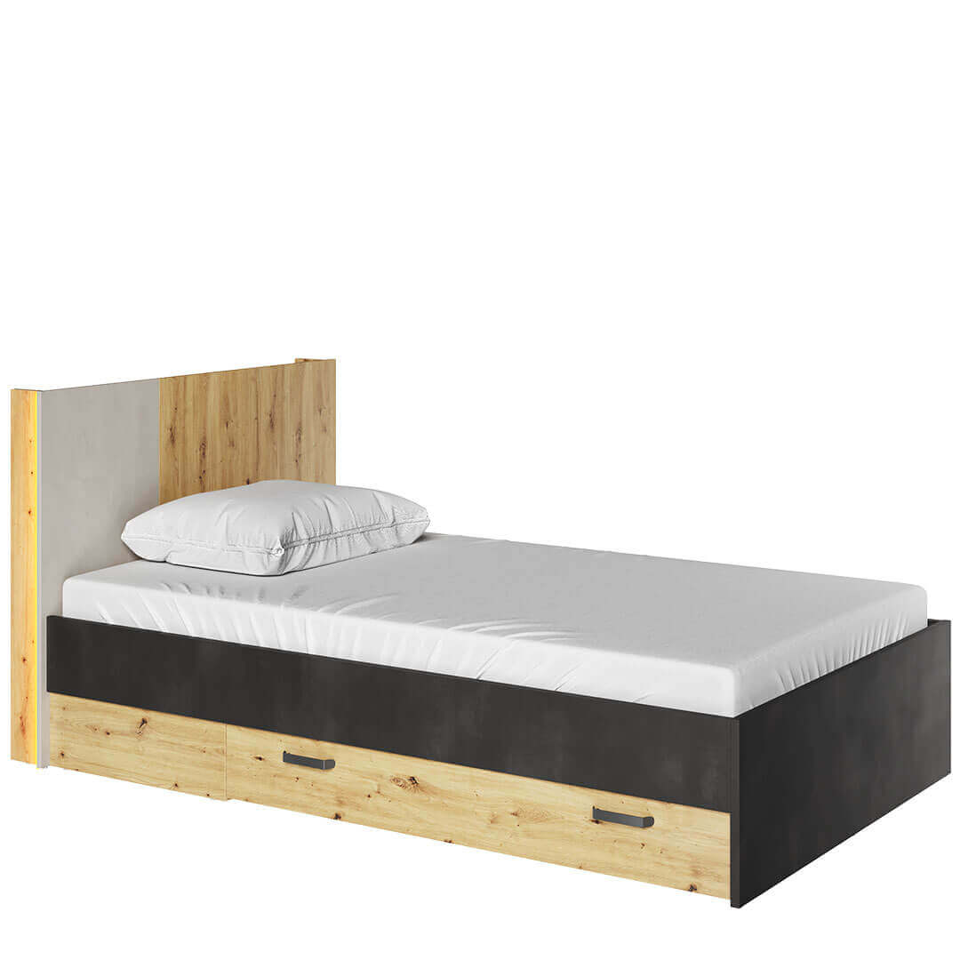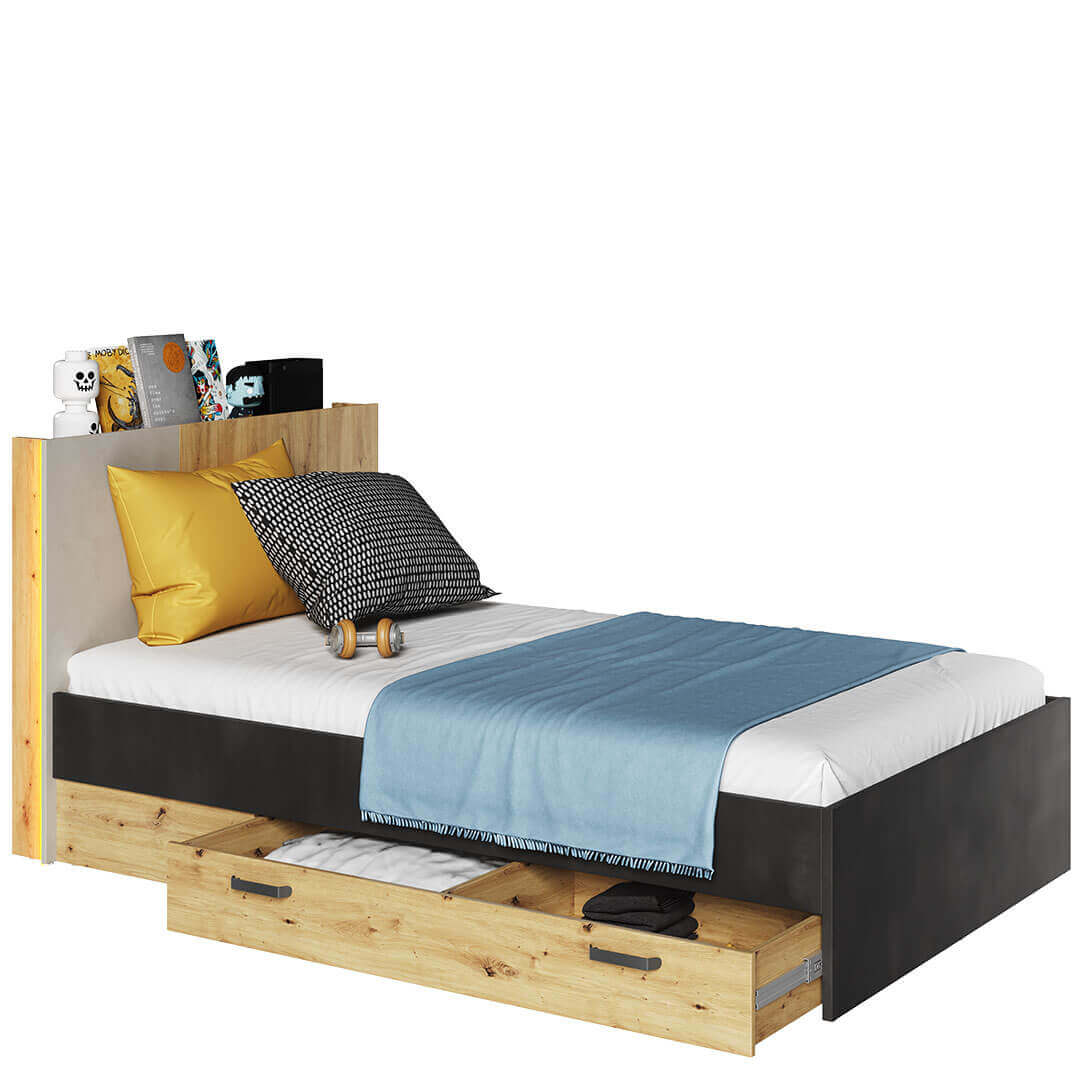 Łóżko młodzieżowe Qubic QB‑11 z dwiema szufladami na pościel, półką w zagłówku i subtelnym oświetleniem LED — komfort i styl w jednym. Powierzchnia spania: 120×200 cm.