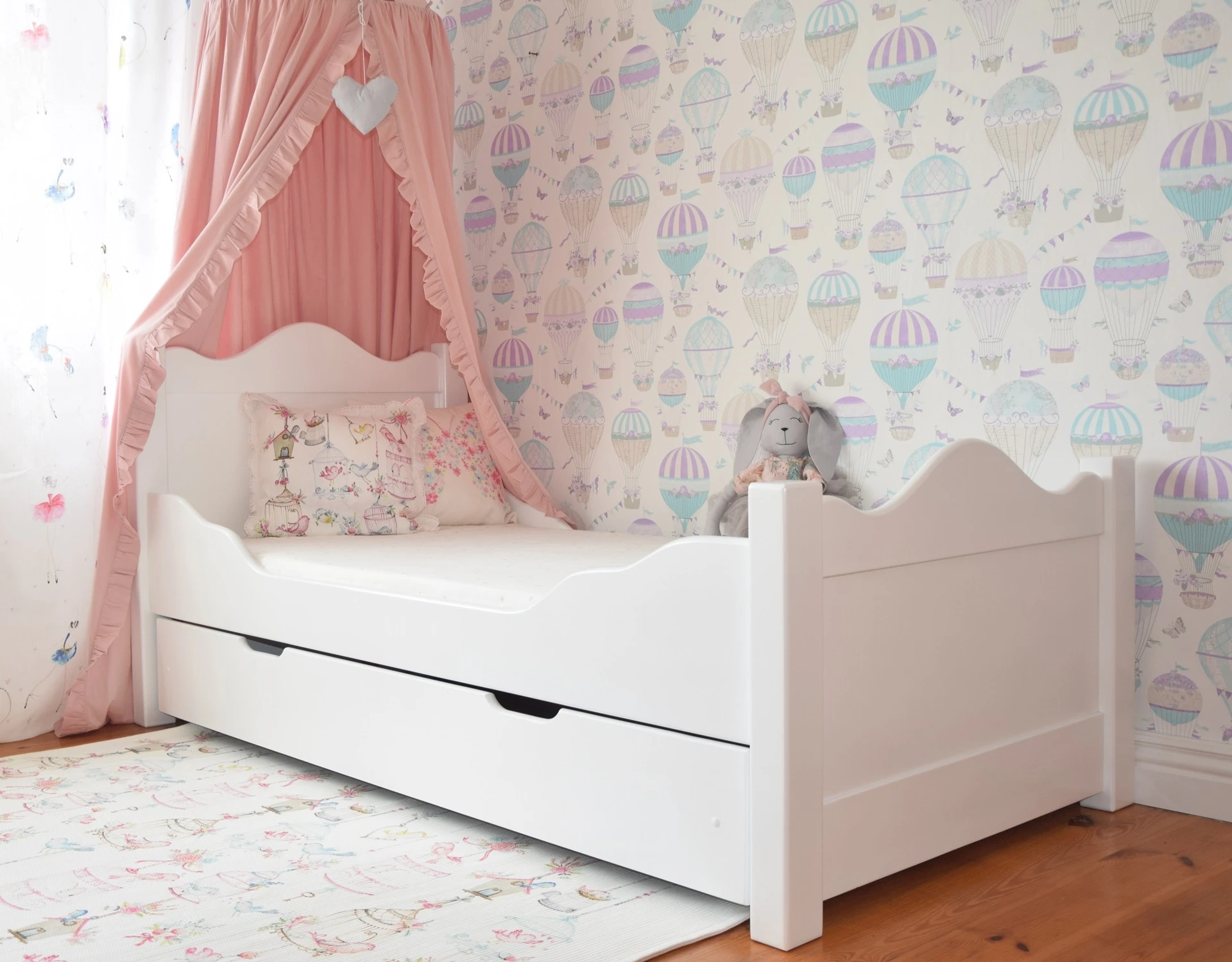 Łóżko drewniane KIARA to eleganckie i funkcjonalne rozwiązanie do pokoju dziecka lub nastolatka. Klasyczna biel oraz subtelne, faliste wykończenia sprawiają, że mebel doskonale wpisuje się w nowoczesne i ponadczasowe aranżacje wnętrz.