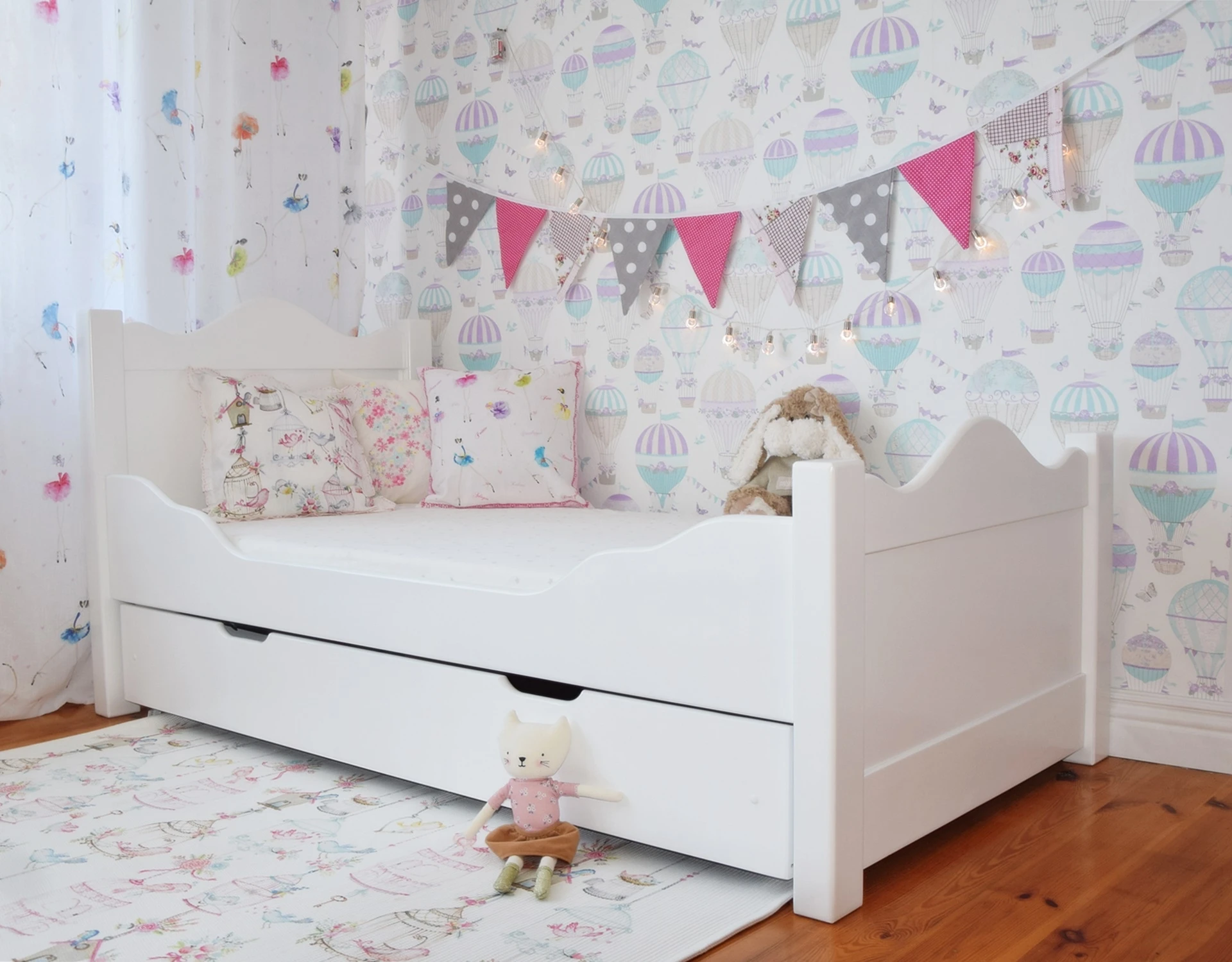Łóżko drewniane KIARA w kolorze białym to solidne i stylowe łóżko młodzieżowe z szufladą. Wykonane z drewna olchowego, stabilne i wytrzymałe – idealne dla dziecka, nastolatka i dorosłego.