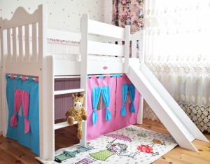 Łóżko dziecięce ZAMECZEK ze zjeżdżalnią i kurtyną – antresola drewniana