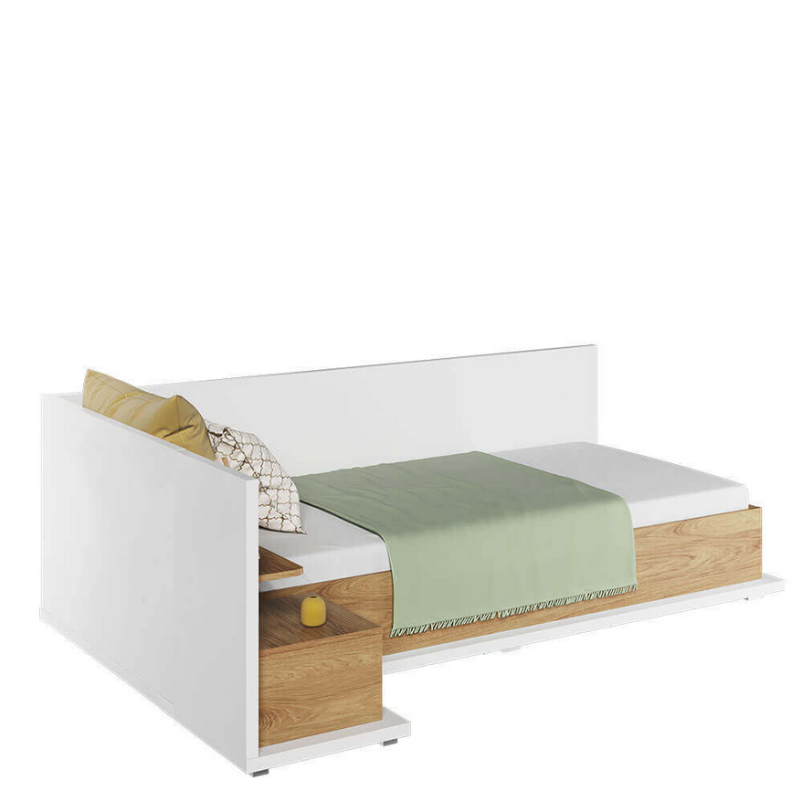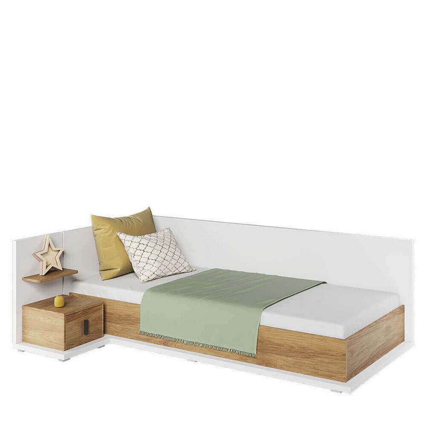 Łóżko MS‑09 L wyróżnia się wyjątkową funkcjonalnością – boczna i górna blenda umożliwia użycie go jako tymczasowej kanapy po dopasowaniu poduszek. Elegancka kombinacja bieli alpejskiej i dekoru hikora naturalna wpisuje się w uniwersalny styl skandynawski, a solidna konstrukcja z laminowanej płyty z obrzeżem ABS gwarantuje trwałe użytkowanie.