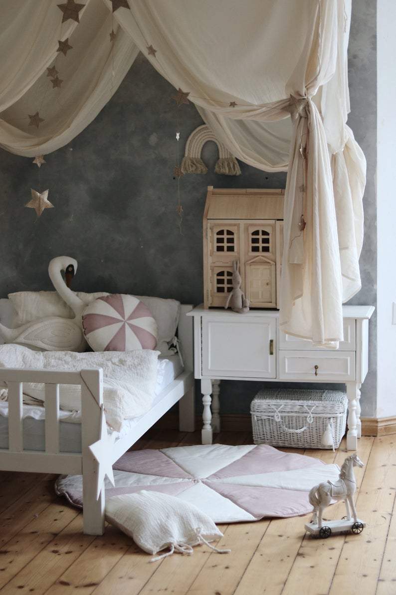 Oryginalna patchworkowa mata jest świetnym dodatkiem do baldachimu, ale może być także używana samodzielnie jako miękki dywanik. Mata jest dwustronna, solidnie zszyta i przepikowana.