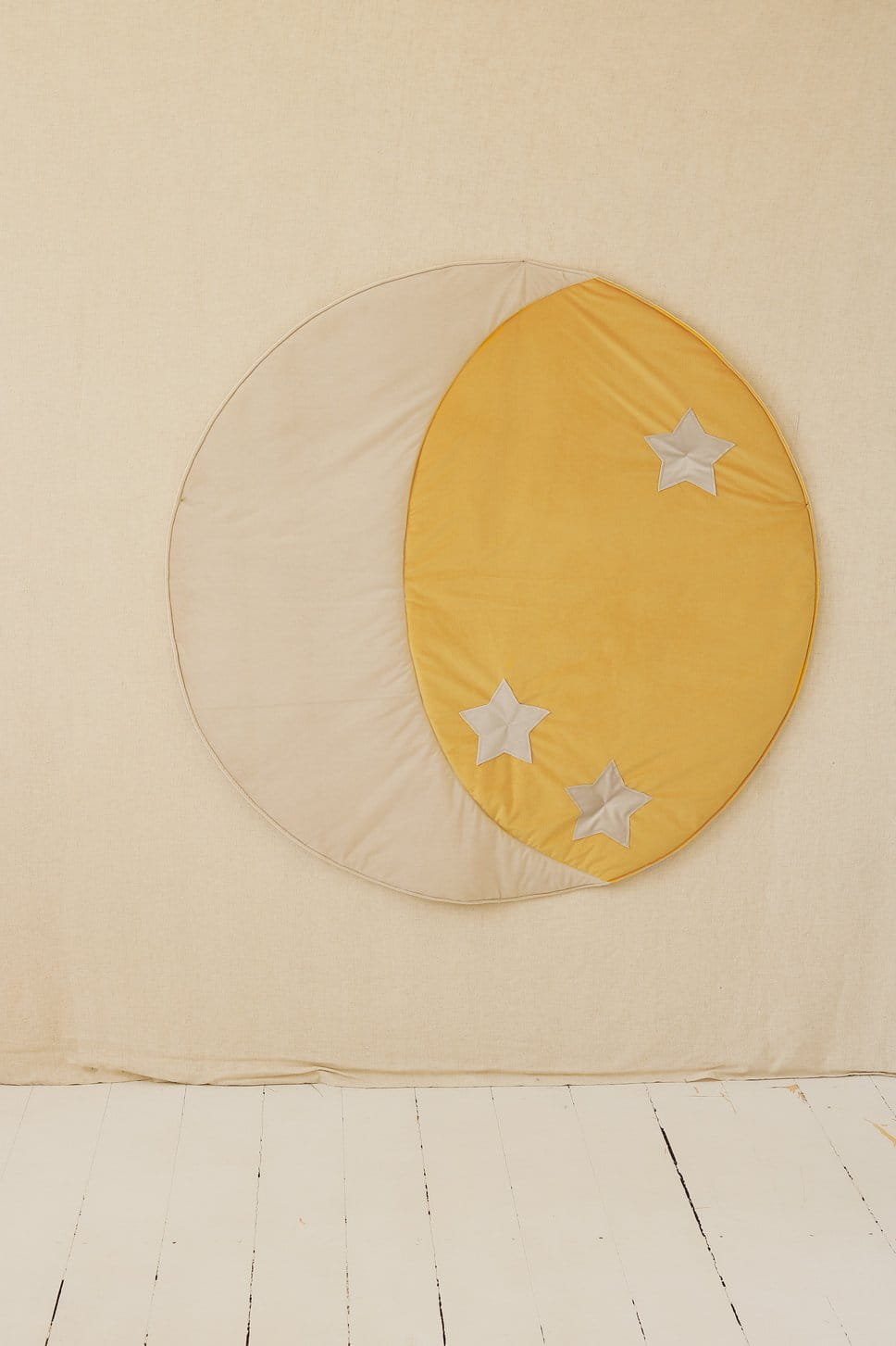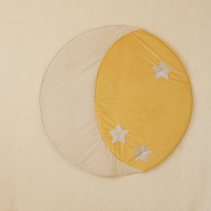 Okrągła mata w wzorem księżyca, solidnie uszyta z puszystego welwetu, w żółtym kolorze. Świetna jako mały dywan przy łóżku, do figli na podłodze czy w ogrodzie. Sprawdza się również w salonie!