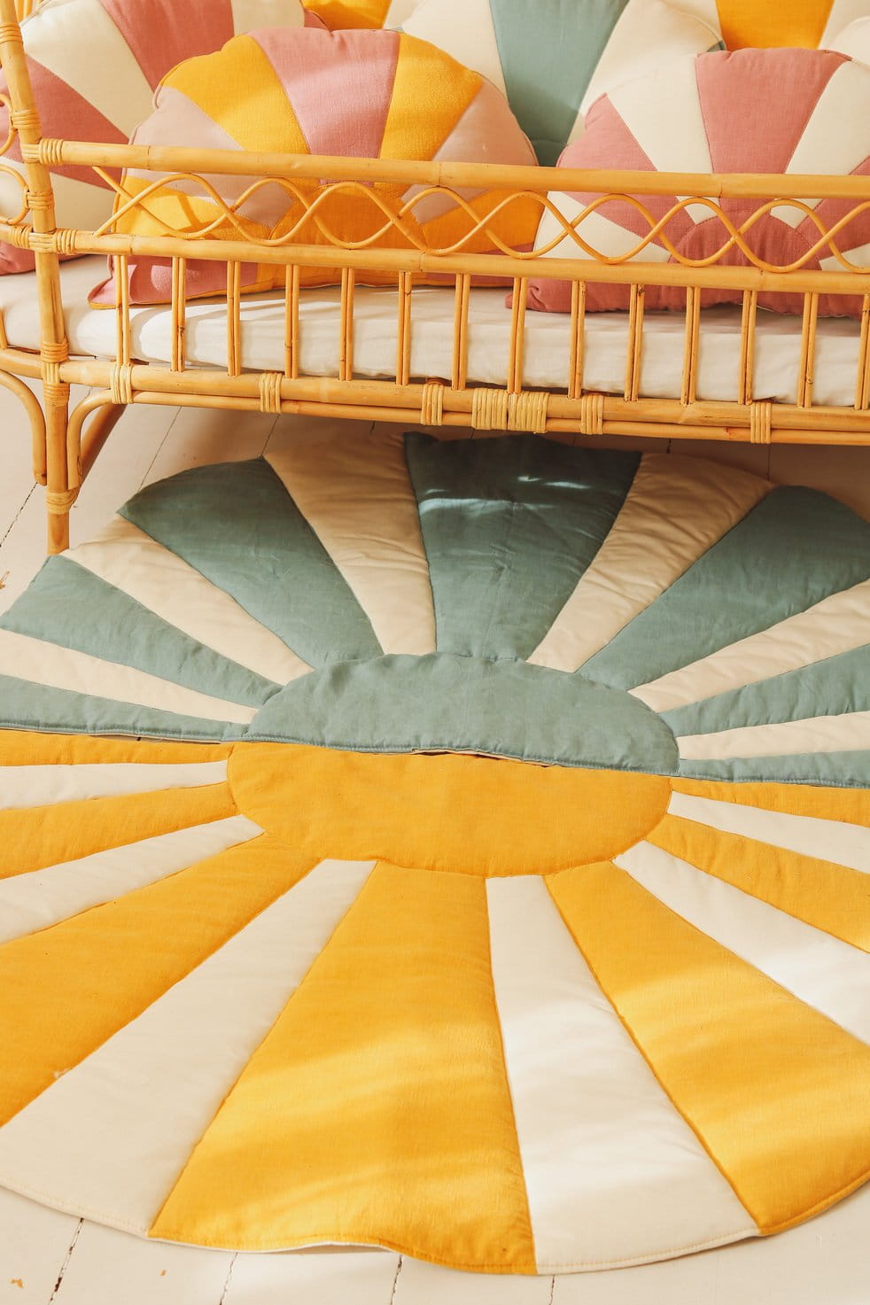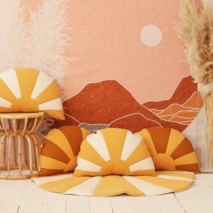 Mata Słońce to świetny, komfortowy dywanik w pokoju maluchów, a także dodatek do namiotu, baldachimu i ozdoba na ścianę. Może być używana także w ogrodzie lub na pikniku do wszelkich zabaw już od najmłodszych lat. Komfortowa mata należy do naszej słonecznej, letniej kolekcji, która powstała z tęsknoty za obezwładniająco piękną kalifornijską przyrodą, totalnym luzem, bandaną na czole i relaksem na kocyku. To nasz hołd dużych dzieci dla następnych pokoleń. Chill! Stwórz cały przytulny kącik dodając do maty nasze poduszkami! Patchworkowa mata w wzorem słońca, solidnie uszyta z puszystego welwetu, w błękitnym kolorze. Świetna jako mały dywan przy łóżku, do figli na podłodze czy w ogrodzie.