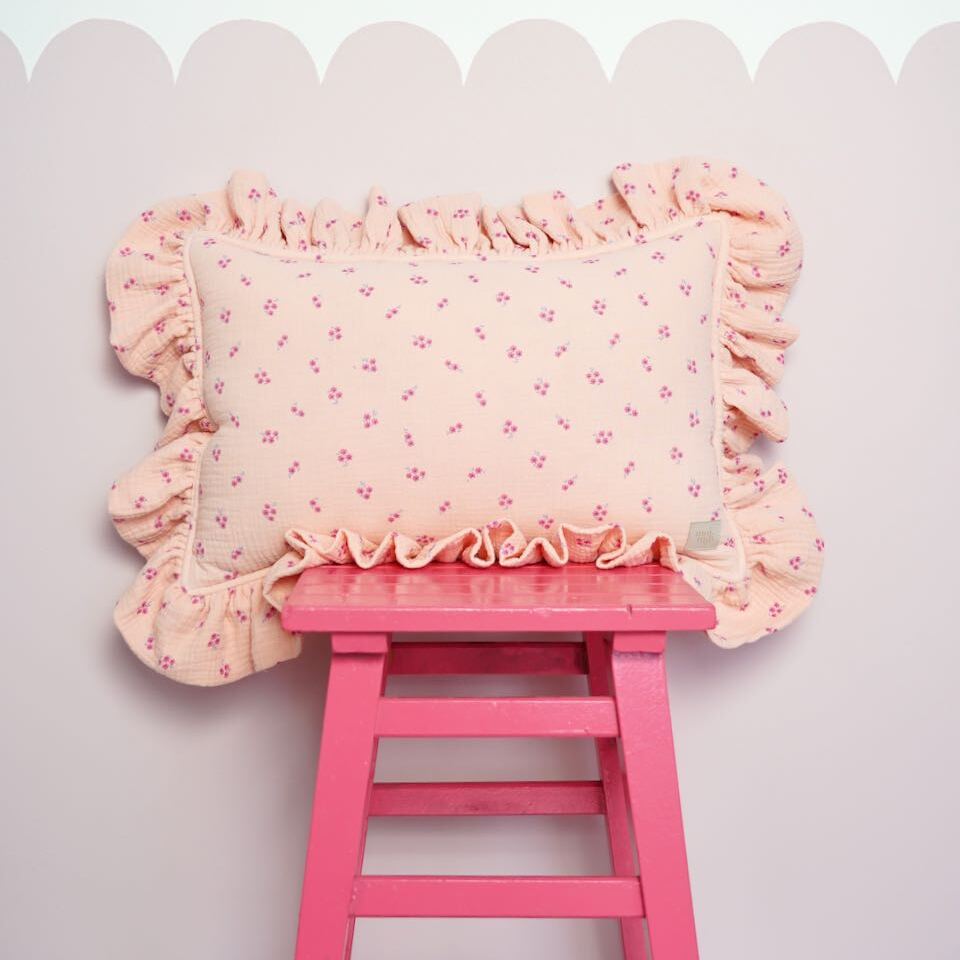 Muślinowa poduszka z falbanką "Różowa niezapominajka"