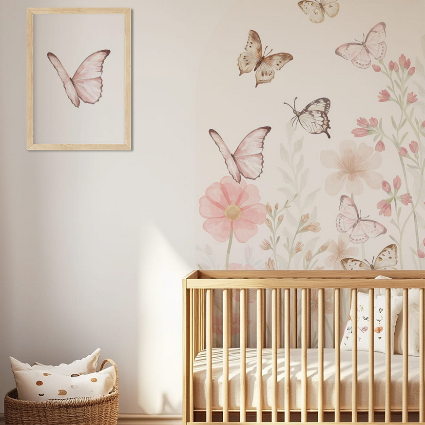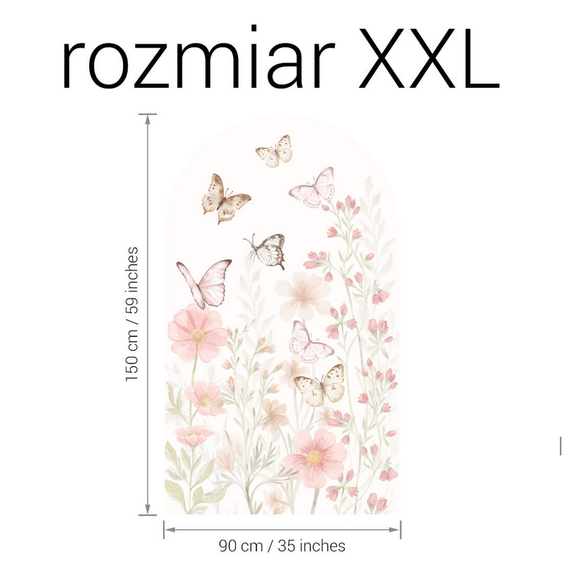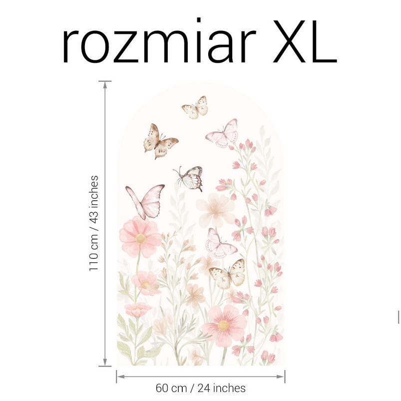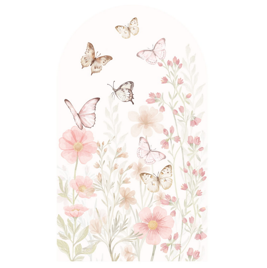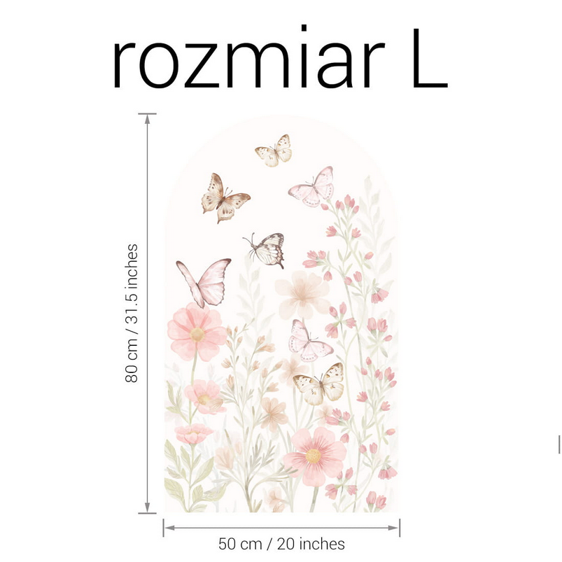 Łuk Motyle to dekoracja ścienna, która wnosi do wnętrza lekkość, delikatność i naturalny klimat. Pastelowe odcienie różu, beżu i zieleni oraz motyw unoszących się motyli pośród kwiatów tworzą spokojną, przytulną atmosferę, sprzyjającą wypoczynkowi i zabawie dziecka.