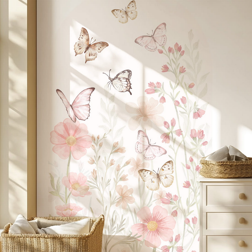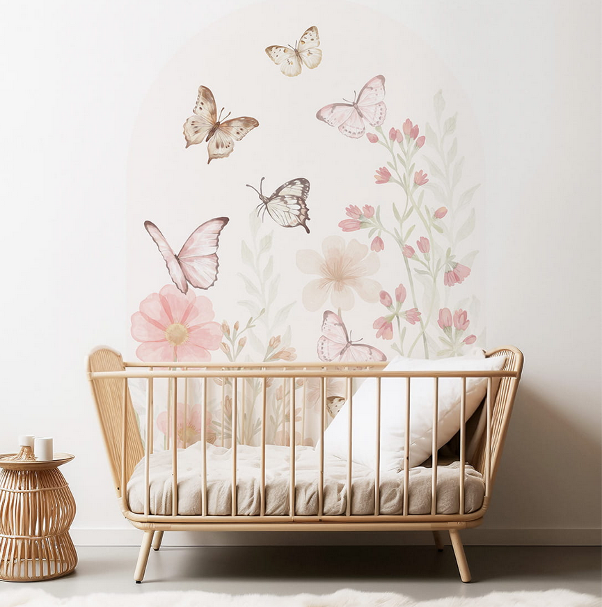 Naklejka na ścianę łuk MOTYLE to subtelna naklejka ścienna – łuk z pastelowymi motylami i kwiatami – idealna do pokoju dziecięcego.