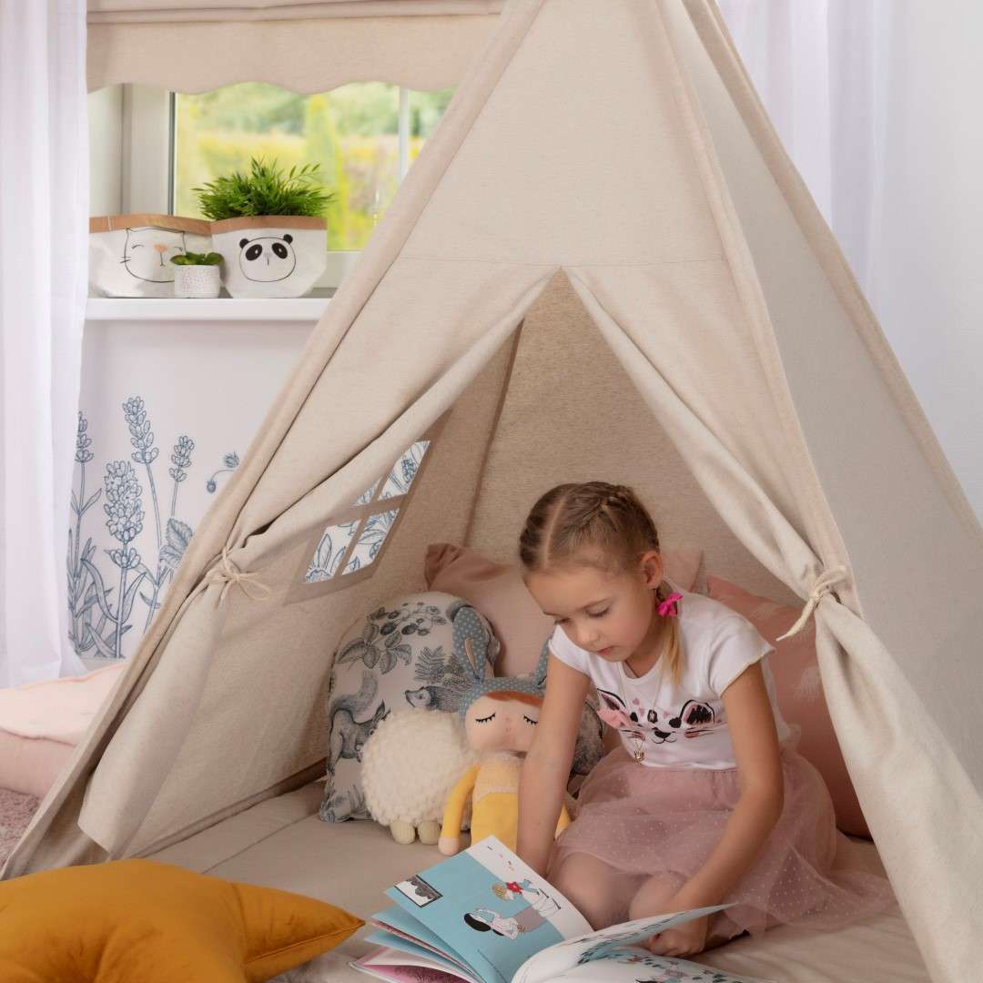 Namiot Tipi to absolutnie ulubione miejsce zabaw dzieci wypełnione po brzegi dziecięcą radością. Pełni rolę barwnej kryjówki, w której maluchy mogą rozwijać swoją kreatywność i abstrakcyjne myślenie, uciąć sobie krótką drzemkę lub wspólnie z rodzicami czytać ulubione bajki. Nadaje się do postawienia w domu, jak również w ogrodzie lub na balkonie. Nasze tipi wyróżnia się ogromną dbałością o detale i wyjątkowymi wzorami tkanin.