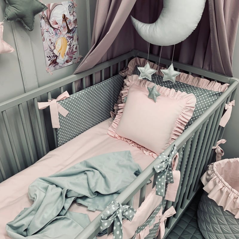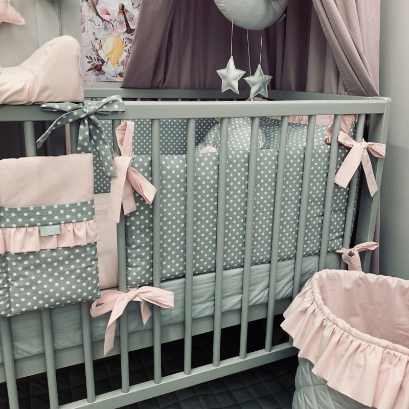 Ochraniacz przymocowujemy do łóżeczka za pomocą przyszytych kokardek.